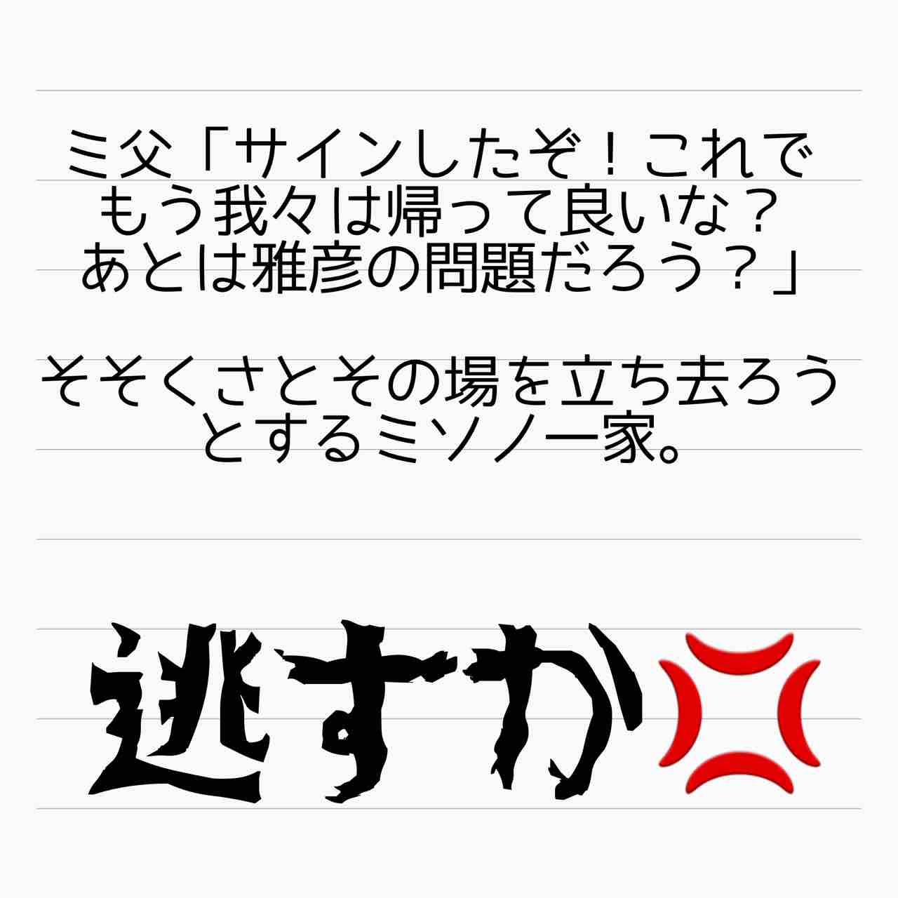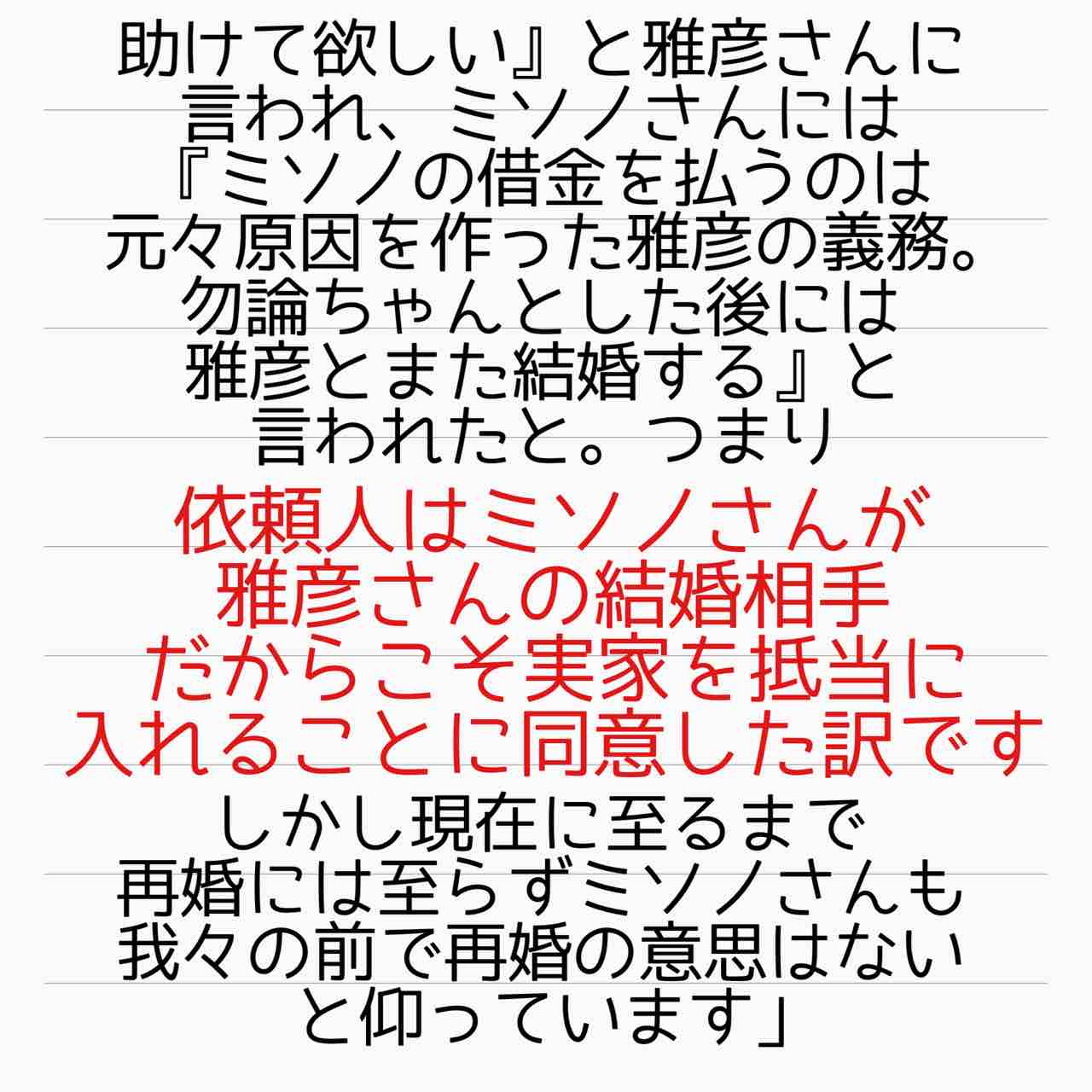 ミソノと再婚するのを条件に実家を抵当に入れたのに現在進行形で再婚してないから不審に思って攻撃に回った訳ですね!