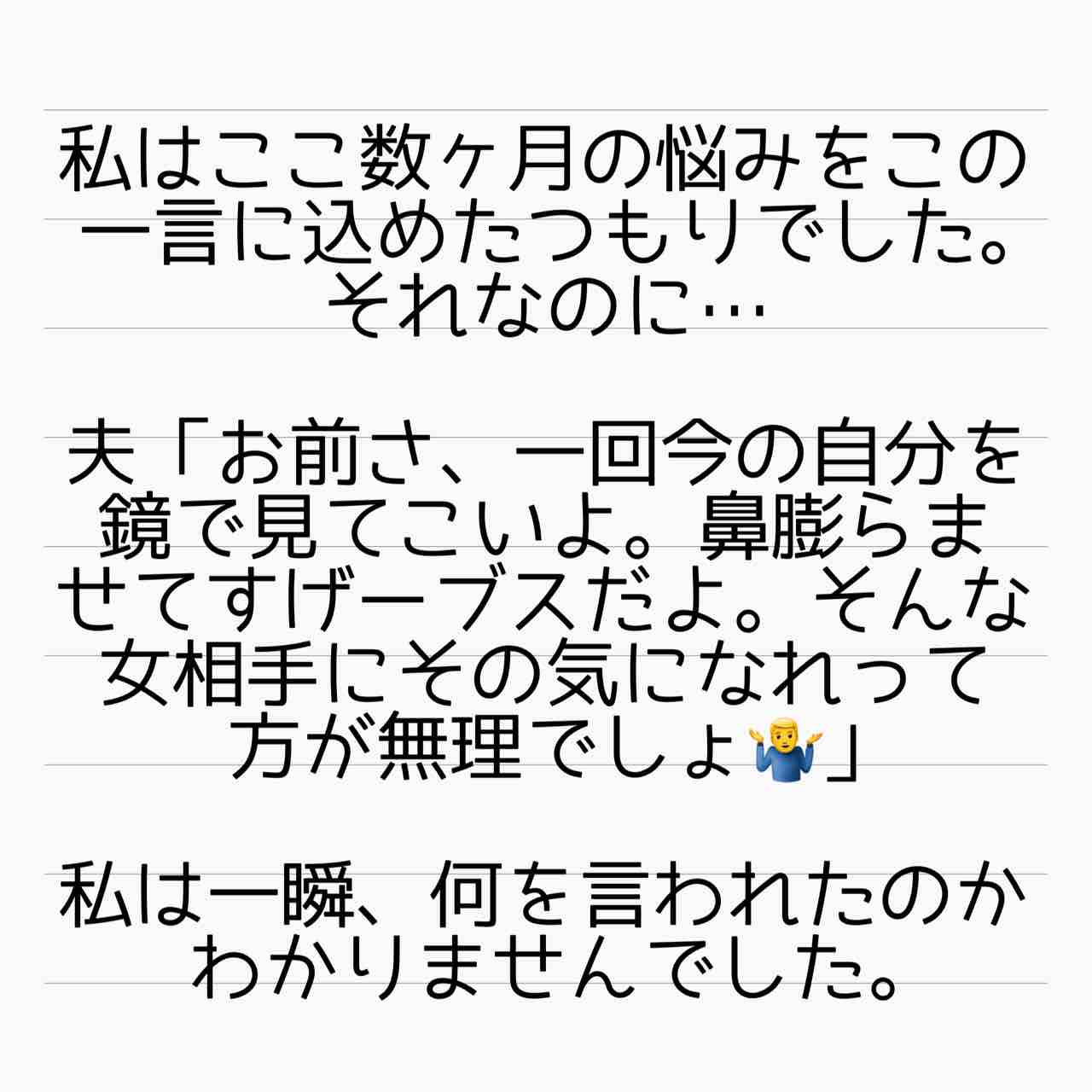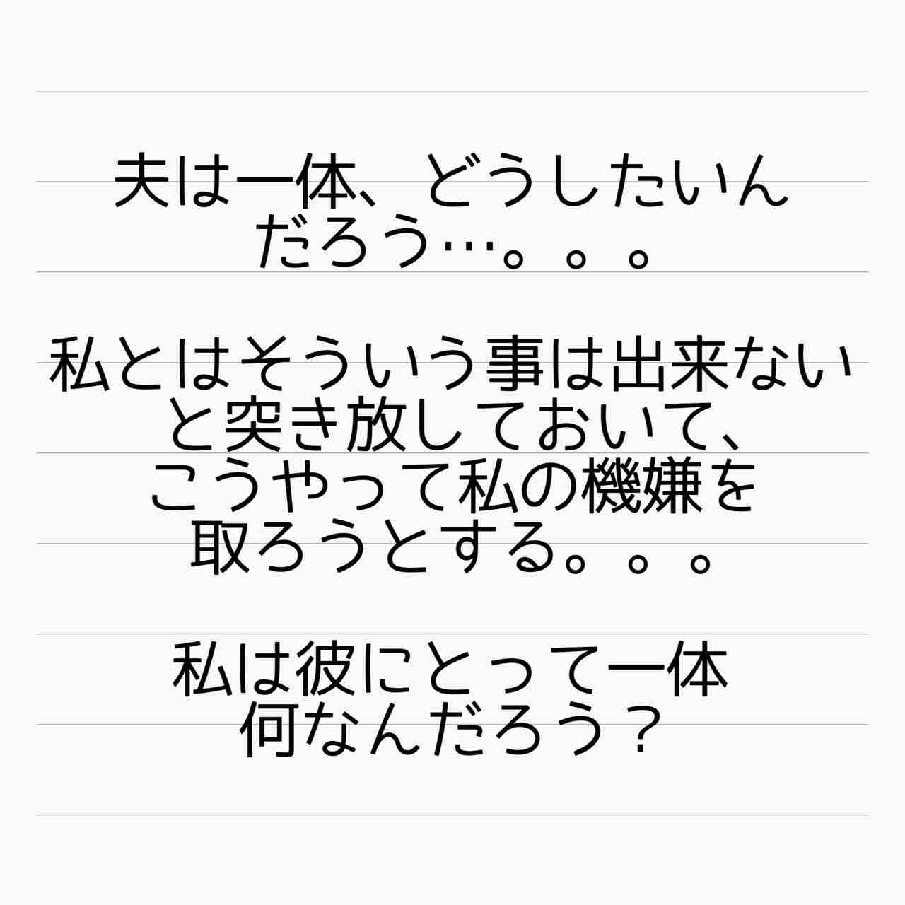 ママ友はフレネミー、そして夫の不倫相手 24 2021年08月23日 いや、妊活に非協力的だからって理由でも、離婚はしてもいいと思う。というより、この時点での旦那さんの言葉はちょっと酷すぎる。。。管理人あいかのサレ妻ストーリーはこちらから(完結済)【海外赴任中の夫が現地女性と重婚していた話】 サレ妻しょう子さんのストーリーはこちらから(完結済)【産後10日でホームレスになった話】 サレ妻かおりさんのストーリーはこちらから(完結済)【セレブ妻かおりが全てを失いかけた話】 ↑LINEで更新通知が受け取れます。↑Twitter開設しました! 「ママ友はフレネミー、そして夫の不倫相手」カテゴリの最新記事 タグ :#不倫#浮気#離婚#サレ妻あいか#サレ妻#フレネミー#ママ友トラブル < 前の記事次の記事 > コメント コメント一覧 (6) 1. あい 2021年08月23日 15:33 なんて酷い言葉…そんな酷い言葉を他人に吐ける神経がわかりません。辛すぎます。 0 サレ妻@あいか がしました 4. サレ妻@あいか 2021年08月24日 01:58 >>1 コメントありがとうございます☺️ 酷すぎますよね…。。。 冗談にしても、すぎてますよ…。。。 0 サレ妻@あいか がしました 2. まーこ 2021年08月23日 15:40 たった一人、身近に女性が言い寄ってきただけで男ってこうも我が強くなるんだなって、残念でなりません。もっともっと綺麗になって最後はスカッとさせてほしいです🎵 0 サレ妻@あいか がしました 5. サレ妻@あいか 2021年08月24日 01:59 >>2 コメントありがとうございます☺️ そうなんですよね…ちょっとちやほやされただけでこの変貌…。。。 最後はスカッといきますよ! 0 サレ妻@あいか がしました 3. 夫の 2021年08月23日 16:07 セリフだけでも十分離婚する理由になるかと思いますけど、その時の美紀さんはもう孤独でどうしようもなかったんだろうと思います。。。 もし自分が言われても号泣できるくらい酷い言葉だと思います。 自分の身なりのこと後回しで一生懸命家事も育児も1人で頑張っているのに。 0 サレ妻@あいか がしました 6. サレ妻@あいか 2021年08月24日 02:00 >>3 コメントありがとうございます☺️ 美紀さん自身、この時は離婚して一人でやっていく自信も奪われていたのかなと思いますね。 私ももし言われていたら…と思うと(似たようなことは言われたかな?ん?)その場で発狂しそうです。。。 0 サレ妻@あいか がしました コメントフォーム 名前 コメント 記事の評価 リセット リセット 顔 星 情報を記憶 コメントを投稿する