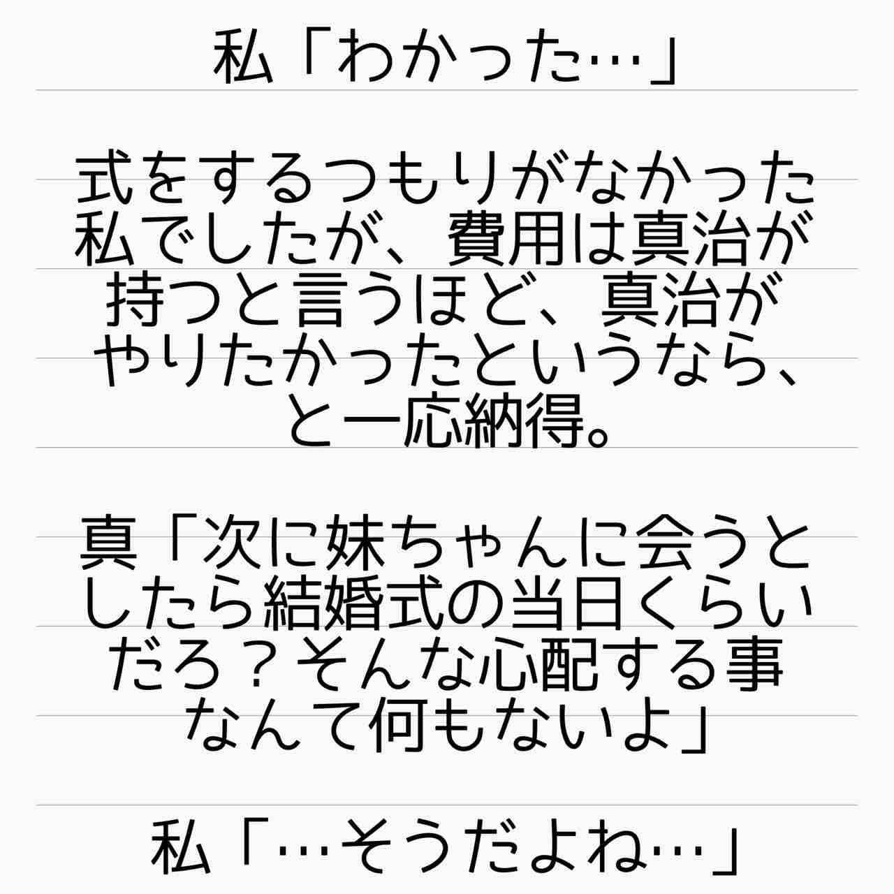 毒妹戦記 11 2021年08月28日 ↓前回のお話「毒妹戦記〜夫の不倫相手は妹でした〜 10」 ↓これまでのお話「毒妹戦記〜夫の不倫相手は妹でした〜」起1/2/3/4/5/6/7/8/9/10管理人あいかのサレ妻ストーリーはこちらから(完結済)【海外赴任中の夫が現地女性と重婚していた話】 サレ妻しょう子さんのストーリーはこちらから(完結済)【産後10日でホームレスになった話】 サレ妻かおりさんのストーリーはこちらから(完結済)【セレブ妻かおりが全てを失いかけた話】 ↑LINEで更新通知が受け取れます。↑Twitter開設しました! 「毒妹戦記〜夫の不倫相手は妹でした〜」カテゴリの最新記事 タグ :#不倫#浮気#サレ妻あいか#離婚#サレ妻 < 前の記事次の記事 > コメント コメント一覧 (10) 1. T 2021年08月28日 12:39 いやさ、口で綺麗事言われても気持ちに寄り添ってくれなきゃ戯言でしかないし。 絶対その写真みちるに送るなよ 送らないで😭 接点作らないで😭 0 サレ妻@あいか がしました 6. サレ妻@あいか 2021年08月29日 06:14 >>1 コメントありがとうございます☺️ ダチョ○倶楽部ーーーー!!!! もう連絡先交換してたってやつですか?!?!?💦 0 サレ妻@あいか がしました 2. ないわないわ! 2021年08月28日 13:07 たしかに可愛いけど。 可愛いけど?! 余計だわ。 それにしても話の書き方が上手で感情移入しちゃう。毎日楽しみにしています!! 0 サレ妻@あいか がしました 7. サレ妻@あいか 2021年08月29日 06:15 >>2 コメントありがとうございます☺️ 嬉しいです! 可愛いけど、は余計すぎますよねえ…👊 0 サレ妻@あいか がしました 3. あ 2021年08月28日 13:33 で、なになに?しんじくん。それちるちるみちるちゃんに送るんでしょ?ははっ 次に行くブライダルフェアにこっそりちゃっかり来ちゃって?みちるちゃんも着る?え? 想像通りじゃなくてももっと突拍子もないことしてくれるんでしょお手上げ〜🤷♀️ 0 サレ妻@あいか がしました 8. サレ妻@あいか 2021年08月29日 06:15 >>3 コメントありがとうございます☺️ チルチルみちる🤣 まさかそんな、ねえ? 0 サレ妻@あいか がしました 4. ぴぴ 2021年08月28日 14:20 大事な話の時に抱きしめる男はだいたい信用できない。誤魔化す気満々かい。 くだらねー男だ。 0 サレ妻@あいか がしました 9. サレ妻@あいか 2021年08月29日 06:16 >>4 コメントありがとうございます☺️ こういう時に抱きしめていいのはビュー○君だけです。 誤魔化すつもりですよね👊 0 サレ妻@あいか がしました 5. もこ 2021年08月28日 14:57 たしかに可愛いけど?はぁ?!◯ね💢 0 サレ妻@あいか がしました 10. サレ妻@あいか 2021年08月29日 06:16 >>5 コメントありがとうございます☺️ かわいいのは別にいらないから、と👊 0 サレ妻@あいか がしました コメントフォーム 名前 コメント 記事の評価 リセット リセット 顔 星 情報を記憶 コメントを投稿する