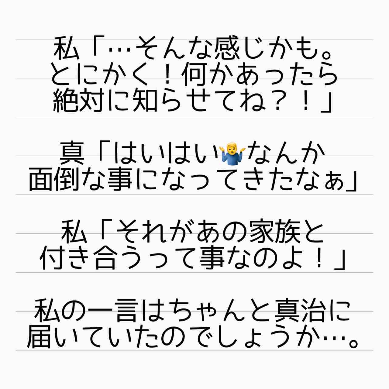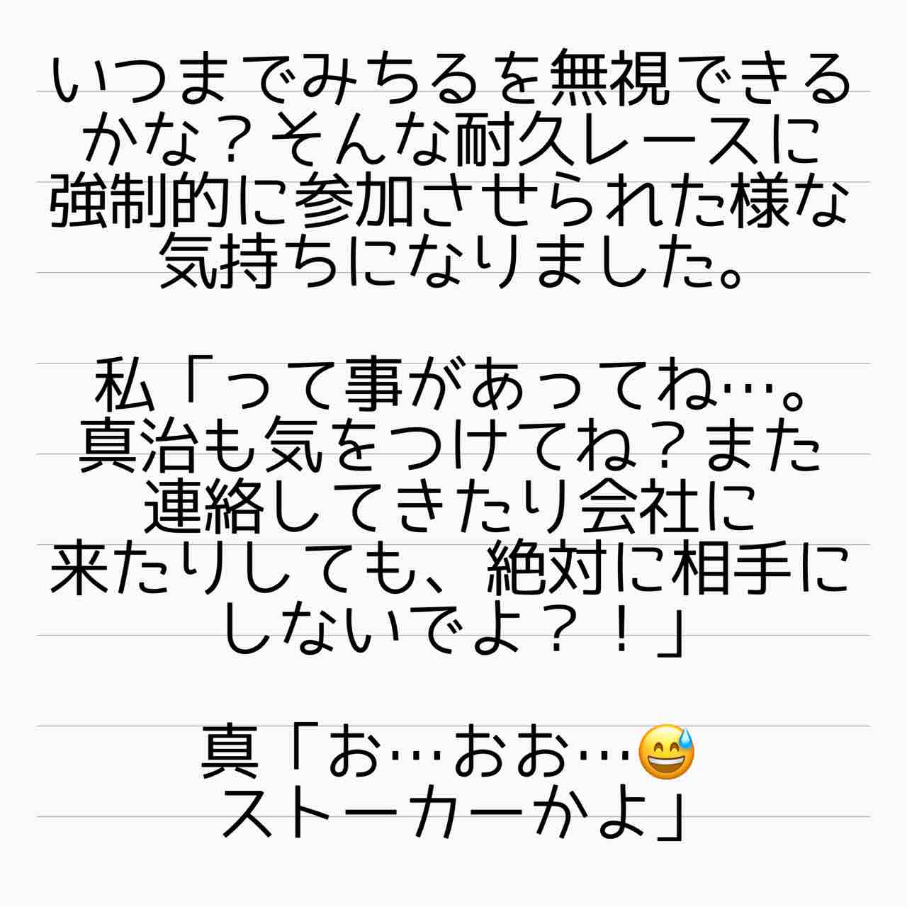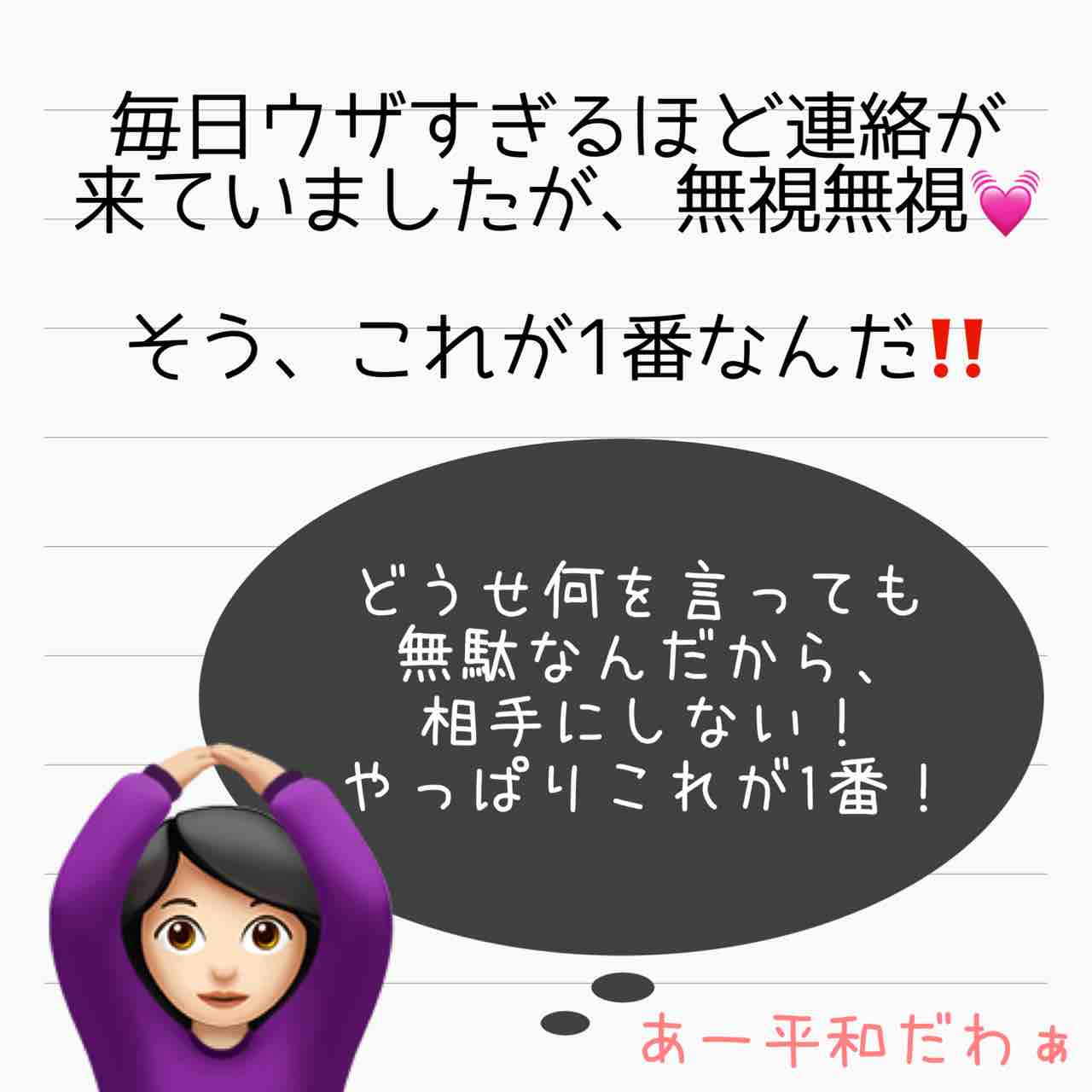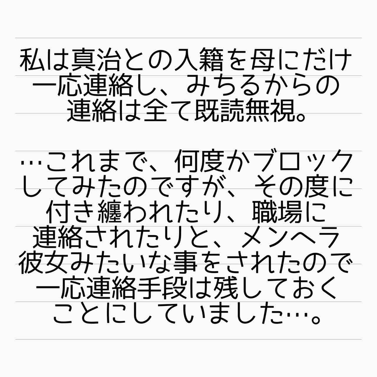 毒妹戦記 25 2021年09月06日 ↓前回のお話「毒妹戦記〜夫の不倫相手は妹でした〜 24」みちる対策。The 完全無視⭐️言ってもわからない人間には、これが一番ですよねっ! ↓これまでのお話「毒妹戦記〜夫の不倫相手は妹でした〜」起1/2/3/4/5/6/7/8/9/10/11/12/13/14/15/16/17/18/19/20/21/22/23/24承25 管理人あいかのサレ妻ストーリーはこちらから(完結済)【海外赴任中の夫が現地女性と重婚していた話】 サレ妻しょう子さんのストーリーはこちらから(完結済)【産後10日でホームレスになった話】 サレ妻かおりさんのストーリーはこちらから(完結済)【セレブ妻かおりが全てを失いかけた話】 ↑LINEで更新通知が受け取れます。↑Twitter開設しました! 「毒妹戦記〜夫の不倫相手は妹でした〜」カテゴリの最新記事 タグ :#サレ妻あいか#不倫#浮気#離婚#サレ妻#毒家族 < 前の記事次の記事 > コメント コメント一覧 (10) 1. T 2021年09月06日 20:14 何でそこまで執着するんだろう。 朝から追いLINE、電話の感覚が激しい、、 何でそこまで妨害したいんだろうね 小さい頃から比べてもらって、 でも幸せそうなのはお姉ちゃんだからかな。 可愛いしか取り柄がなくて、 友達にも見下すことが普通になってたから仲良くなれる人は少なくて、家の外ではお姉ちゃんの方が満たされてそうだもんね。 家族しか自分には居なくて孤独なのかな。 0 サレ妻@あいか がしました 6. サレ妻@あいか 2021年09月07日 02:49 >>1 コメントありがとうございます☺️ きっと、足るを知らないから満たされてないんでしょうね。 どこまで行っても姉と比べて、自分の幸せを測る。。。 0 サレ妻@あいか がしました 2. ゆい 2021年09月06日 20:42 あんたが大嫌い。 二度と関わらないでほしい。 それでも関わりたいなら貸した500マン耳揃えて返してから意見して! って言えばいいのに。 何言われても貸した金返してから! 意見は全て貸した物返してから!(絶対返せないから黙ると思うけど… 0 サレ妻@あいか がしました 7. サレ妻@あいか 2021年09月07日 02:50 >>2 コメントありがとうございます☺️ こういう人は直接そう言っても、「えーどぅしてそんなこと言うのぉ」とまともに取り合ってくれないのかと。。。 0 サレ妻@あいか がしました 3. りーちゃん 2021年09月06日 21:39 真治の「お…おぉ」怪しい。 怪しすぎる。 さては既に連絡取ったな? 0 サレ妻@あいか がしました 8. サレ妻@あいか 2021年09月07日 02:54 >>3 コメントありがとうございます☺️ さすが、気付きますよね🤣 0 サレ妻@あいか がしました 4. パンダになりたい 2021年09月06日 22:07 このサイコsisはリアルジャイアンですな。 姉のものは私のもの、私のものは私のもの。 めぐみは私の言うこと聞いてればいい。 めぐみの意見は何一つ通すつもりは無い。 私が金よこせと言ったら出せ。 めぐみの旦那も私のもの。 私の思いどおりにならないものは無い。 と言いたいのですな。 スゴいぞ。 法治国家の倫理観はどこへいったんだろう? 0 サレ妻@あいか がしました 9. サレ妻@あいか 2021年09月07日 02:55 >>4 コメントありがとうございます☺️ リアルジャイアン、おっしゃる通りです。 幼い頃からそう育ってきたんでしょうね。。。 0 サレ妻@あいか がしました 5. みみ 2021年09月06日 22:50 物語の行方が気になりすぎます。めぐみさん、幸せになって欲しい。 0 サレ妻@あいか がしました 10. サレ妻@あいか 2021年09月07日 02:55 >>5 コメントありがとうございます☺️ めぐみさんも今は幸せに暮らしておられますよ!☺️ 0 サレ妻@あいか がしました コメントフォーム 名前 コメント 記事の評価 リセット リセット 顔 星 情報を記憶 コメントを投稿する