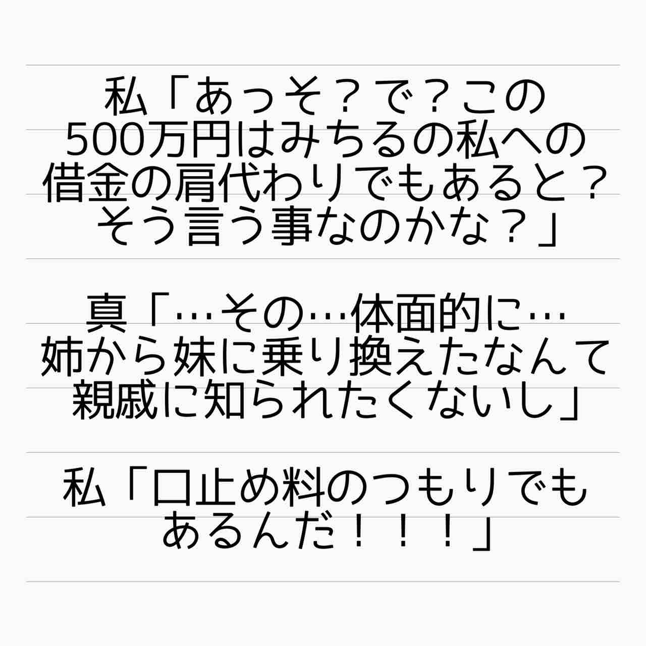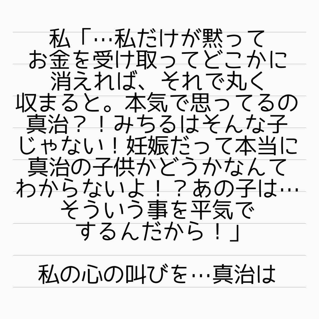 それならみちるの借金肩代わりしか払ってないことになるし。慰謝料200万円とみちるへの慰謝料請求肩代わりの100万円と、口止め料まで含めたら1000万円は下らないと思います。