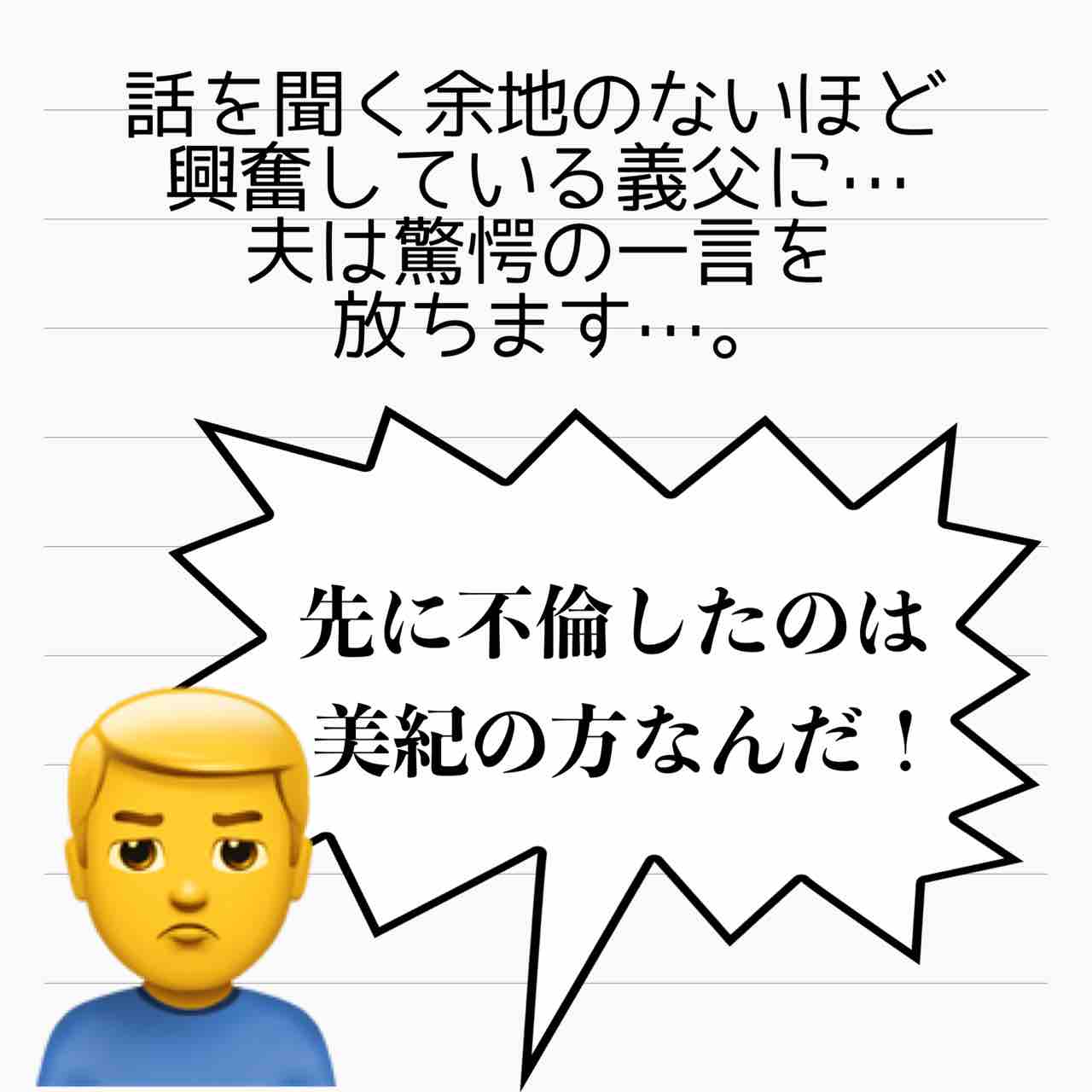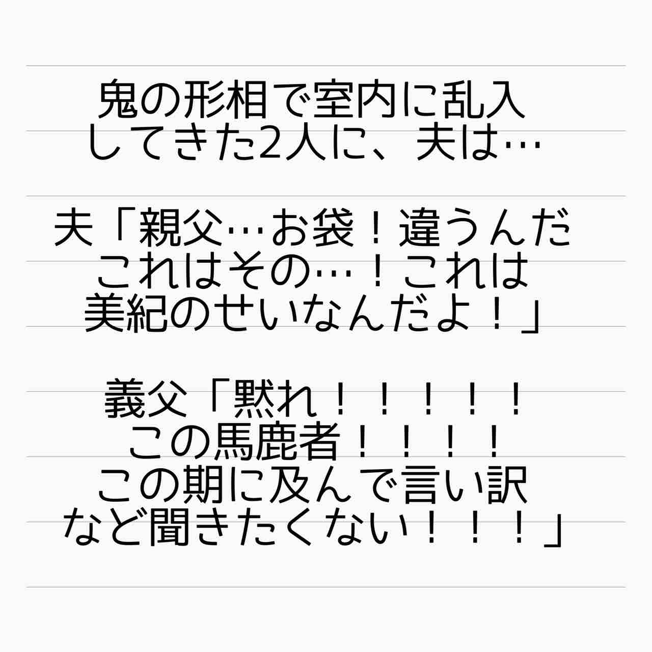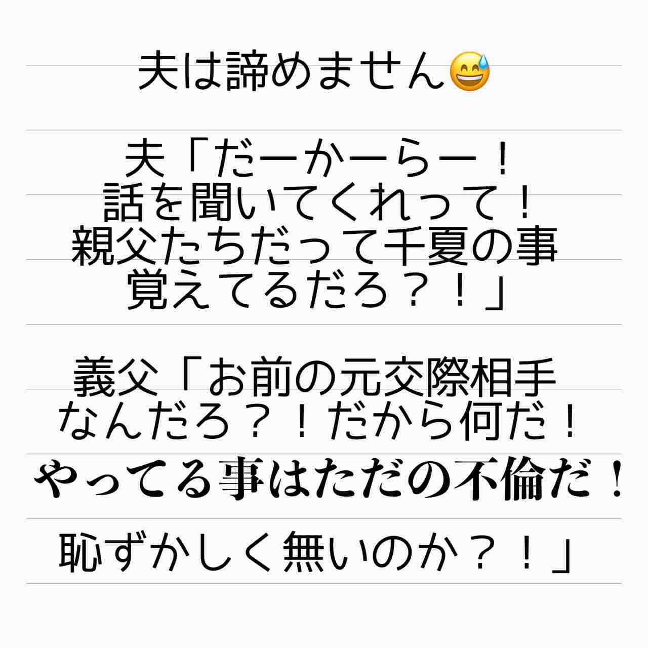 真偽の程とは別に、その理由自体が自分と千夏の不倫を正当化するものでは全くありませんが、それでも自分がそう思うなら、なぜ自分の両親が来る前にそれを言わなかったんですか??なんかなんか、この名無し夫、全く筋が通ってませんよね。