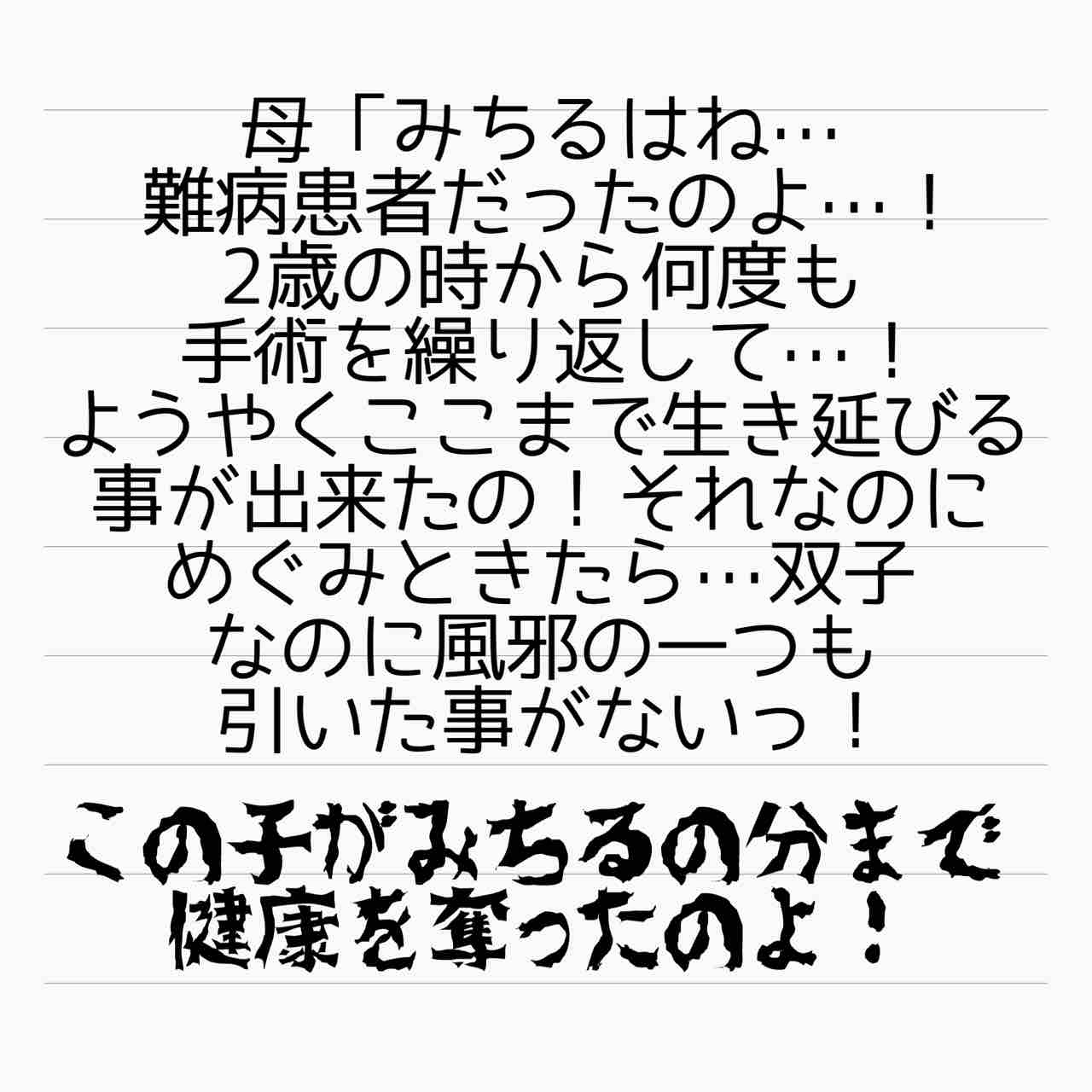 めぐみさんが健康なのはいい事だけど、それをめぐみさんがみちるの健康を奪ったって事にはならないでしょ