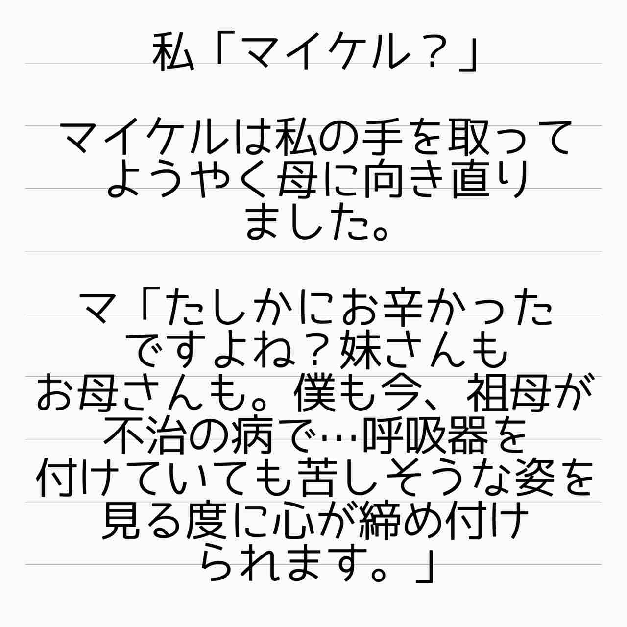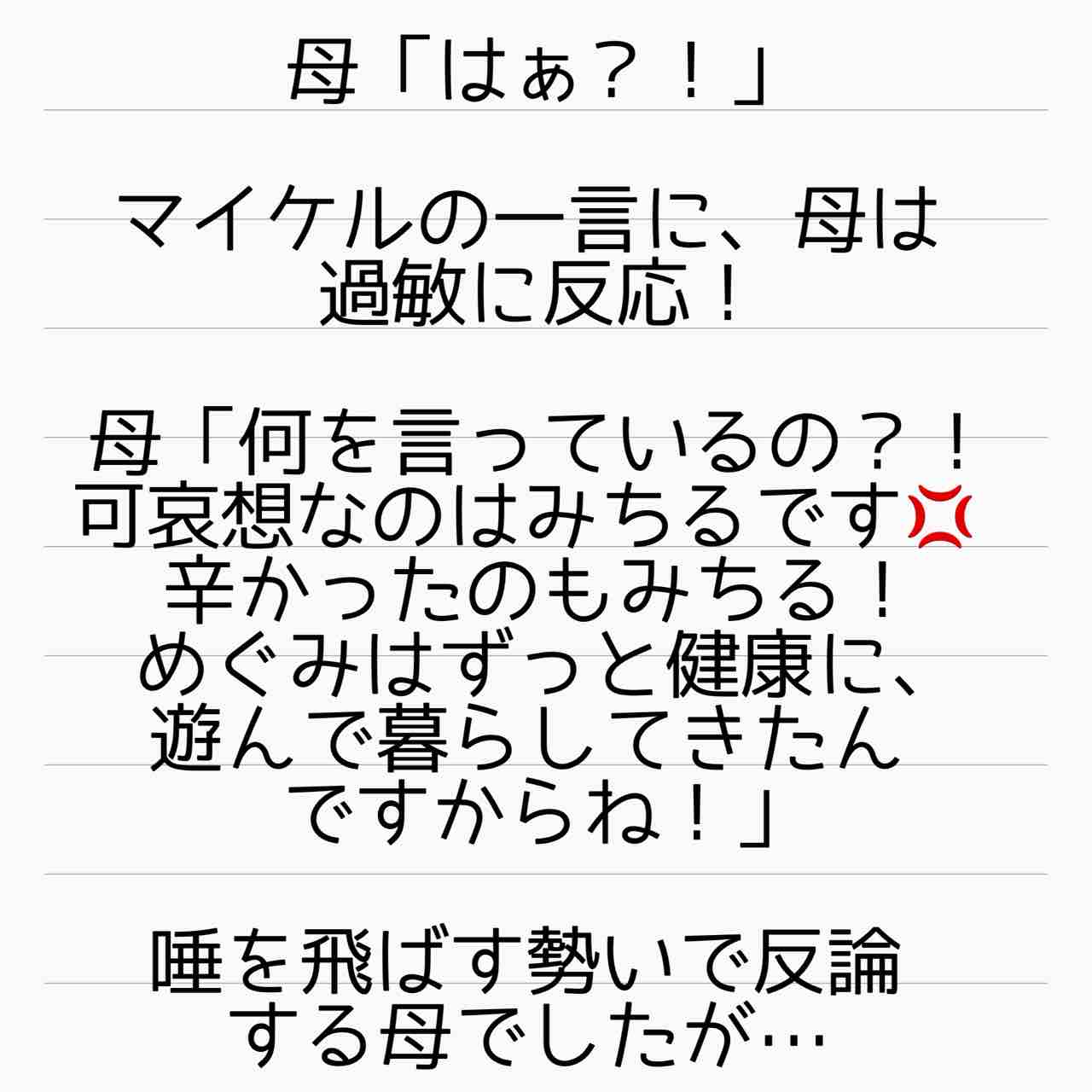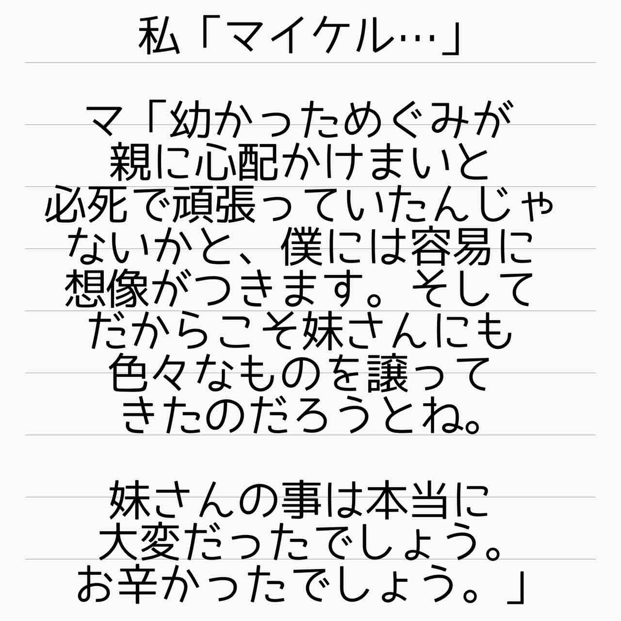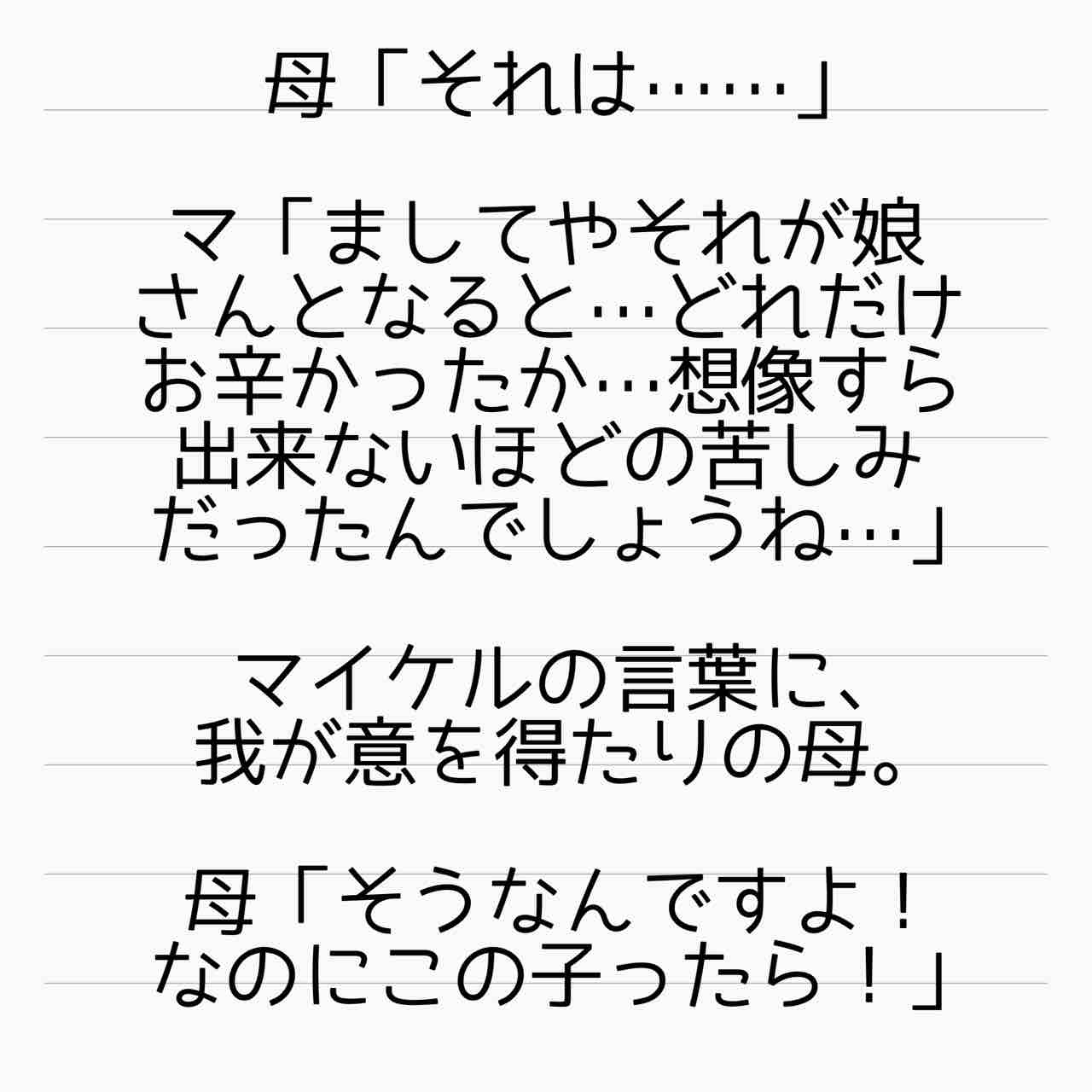 しかし今までこの母親にマイケルのような言葉を掛ける人、いなかったんですかね。いたとしてもキーキー騒ぎ立てて聞く耳もたなかったのかな。めぐみさんがずっと我慢して助けを求められなくて誰も知らなかったとしたら悲しいな…。
