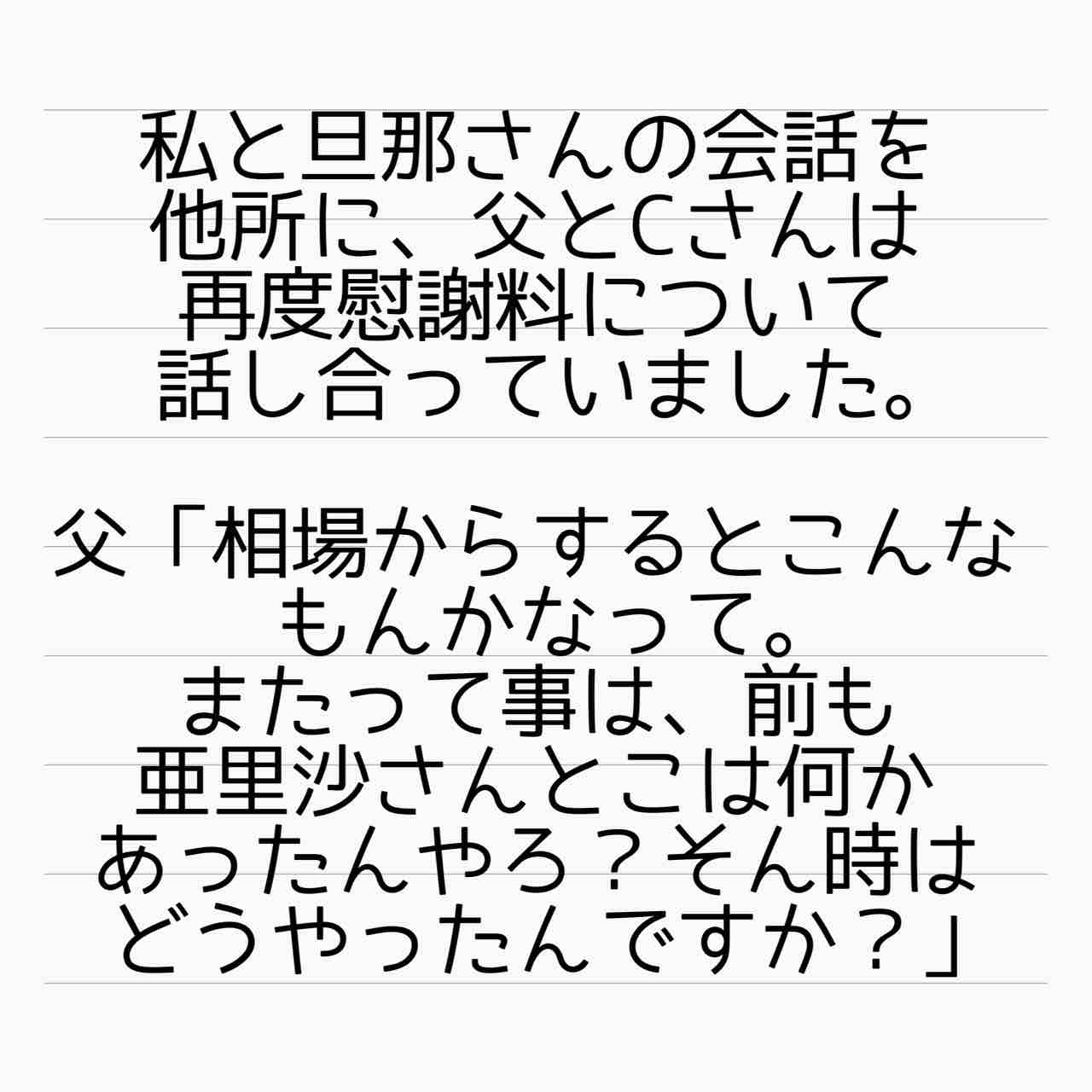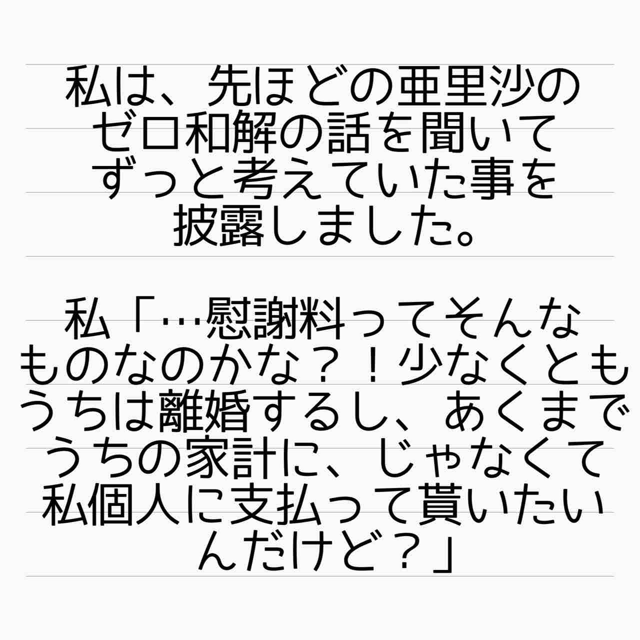 ゼロ和解はさ、アリサ旦那が出してくれたらの話だし、そんなデリケートな話をペラペラ話されてたの情けないだろうし、そんなことも考えないアリサは旦那さんを見くびってたよね。