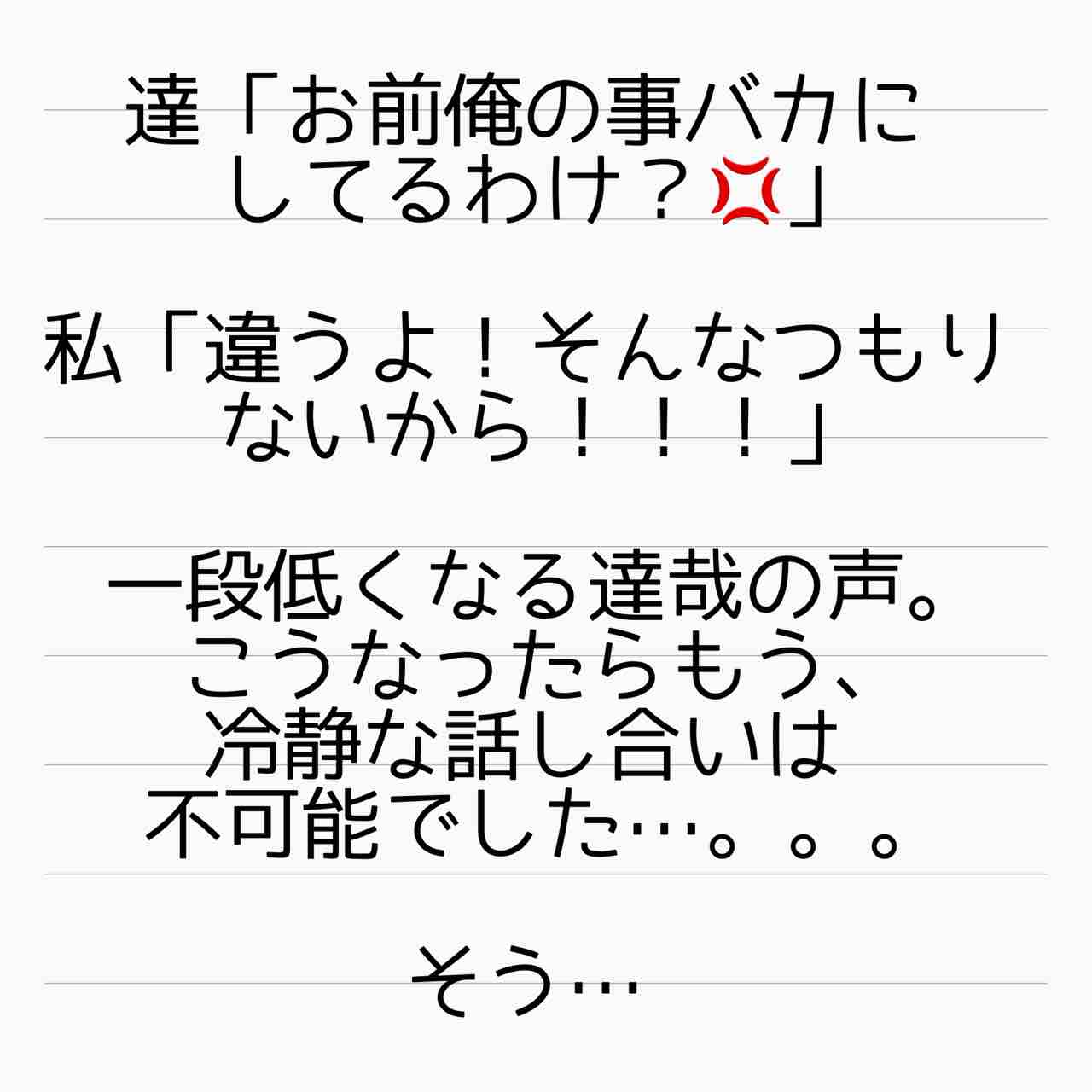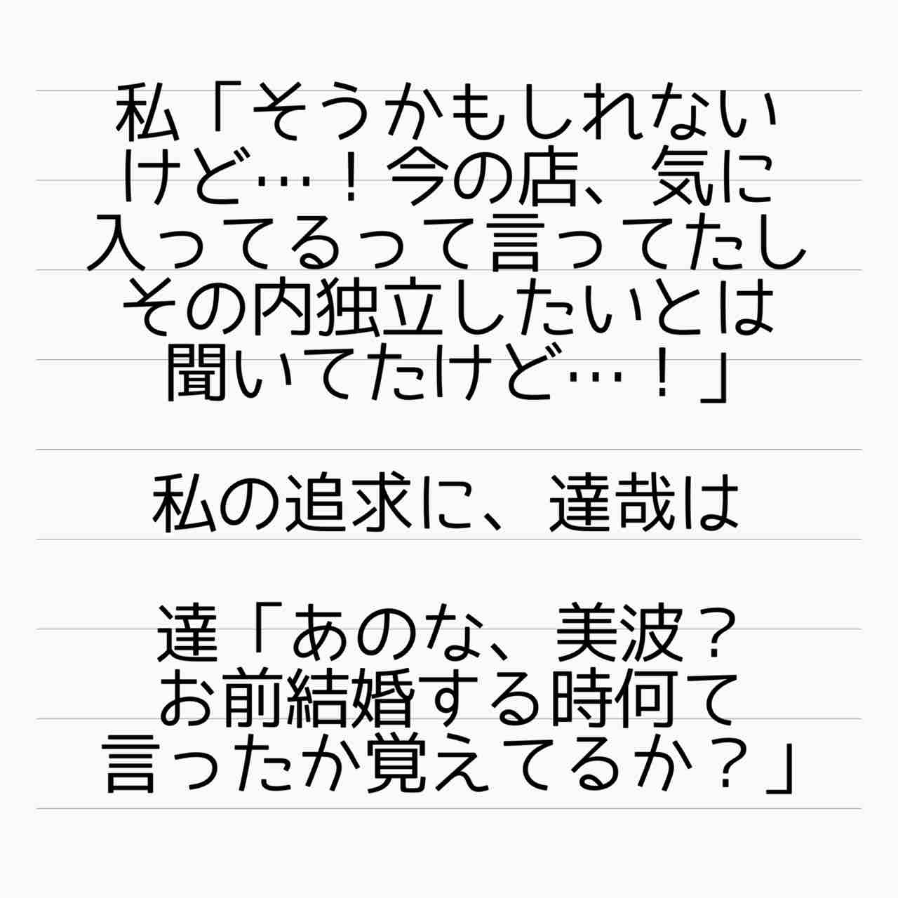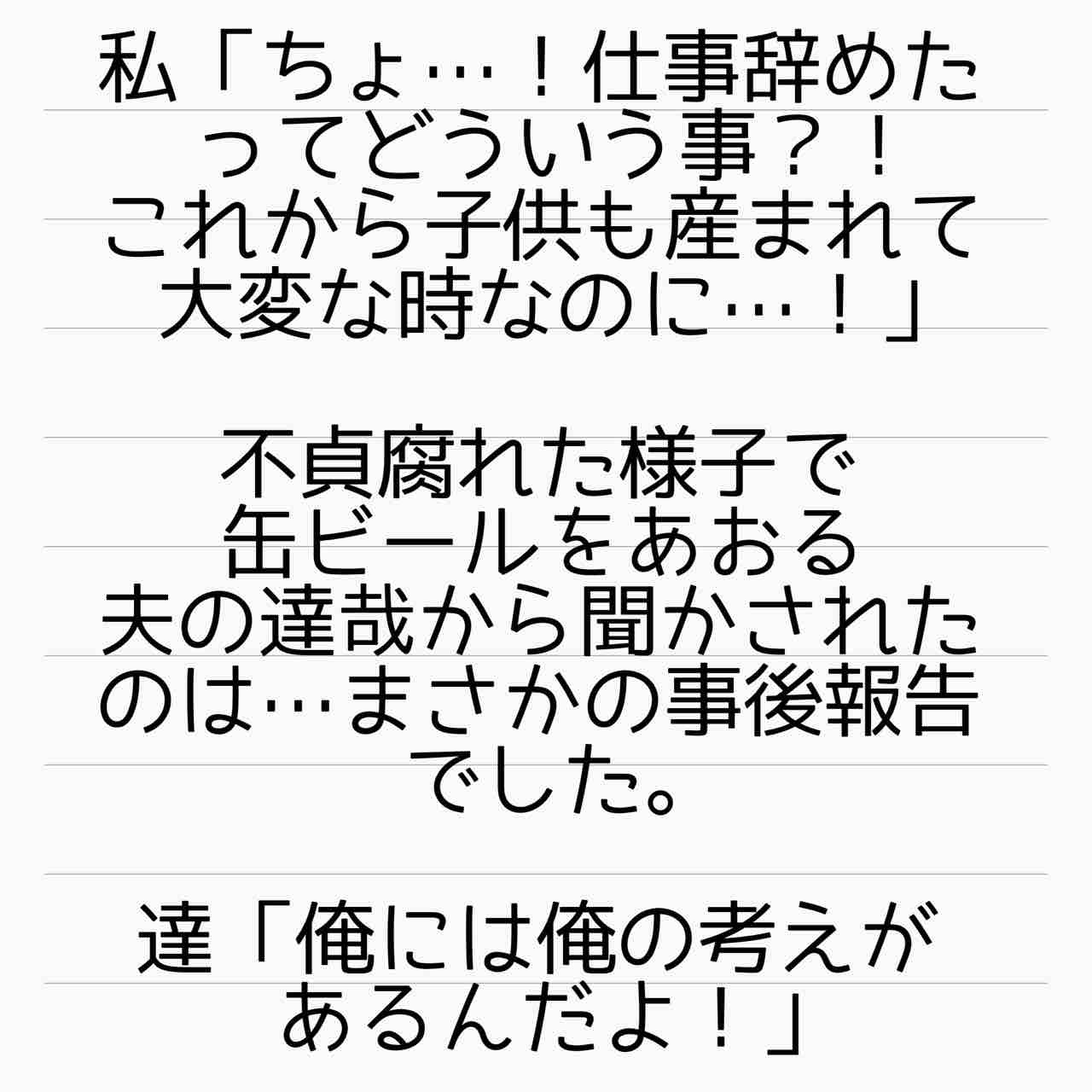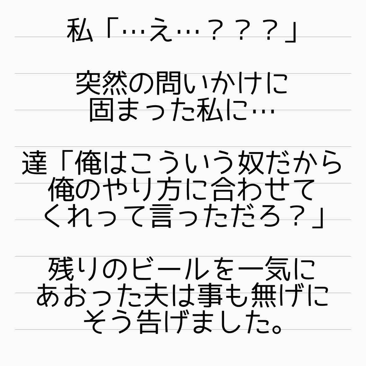 結婚相手は地雷男 1 2022年01月01日 新しいお話が始まります!モラハラに悩まされる主婦美波さんの、サレ妻体験&逆転人生のお話です!またご覧頂けると幸いです! 管理人あいかのサレ妻ストーリーはこちらから(完結済)【海外赴任中の夫が現地女性と重婚していた話】 サレ妻しょう子さんのストーリーはこちらから(完結済)【産後10日でホームレスになった話】 サレ妻かおりさんのストーリーはこちらから(完結済)【セレブ妻かおりが全てを失いかけた話】 サレ妻美紀さんのストーリーはこちらから(完結済)【ママ友はフレネミー、そして夫の不倫相手】 サレ妻めぐみさんのストーリーはこちらから(完結済)【毒妹戦記〜夫の不倫相手は妹でした〜】 ↑LINEで更新通知が受け取れます。↑Twitter開設しました! 「結婚相手は地雷男〜サレ妻美波の逆転人生!〜」カテゴリの最新記事 タグ :#サレ妻,サレ妻あいか,毒家族,実話,浮気,不倫,離婚,毒親 < 前の記事次の記事 > コメント コメント一覧 (22) 1. トルネードロールケーキ 2022年01月01日 12:06 これはイライラしちゃう予感……! 明けましておめでとうございます!🤣 0 サレ妻@あいか がしました 12. サレ妻あいか 2022年01月02日 05:05 >>1 コメントありがとうございます☺️ イライラしそうですよね💦 0 サレ妻@あいか がしました 2. カフェラテ 2022年01月01日 12:19 あけましておめでとうございますm(*_ _)m 今年もよろしくお願いします。🐯 既にダメ男の匂いがするw 0 サレ妻@あいか がしました 13. サレ妻あいか 2022年01月02日 05:12 >>2 コメントありがとうございます☺️ この時点ですでにやばいですよね😅 0 サレ妻@あいか がしました 3. ハル 2022年01月01日 12:23 明けましておめでとうございます🎍 俺様ダメンズ…… 1話からイライラしております😡… 0 サレ妻@あいか がしました 14. サレ妻あいか 2022年01月02日 05:13 >>3 コメントありがとうございます☺️ 初っ端からモラハラ全開です😂 0 サレ妻@あいか がしました 4. ひろみ 2022年01月01日 12:23 あけましておめでとうございます すでにこの男、イライラするわ〜 先のこと考えてるとは思えない言動よね 0 サレ妻@あいか がしました 15. サレ妻あいか 2022年01月02日 05:13 >>4 コメントありがとうございます☺️ 思えませんよねえ。。。 0 サレ妻@あいか がしました 5. T 2022年01月01日 12:24 こわいこわいこわい・・・ 毎回ヤバい話が始まる🙈 0 サレ妻@あいか がしました 16. サレ妻あいか 2022年01月02日 05:13 >>5 コメントありがとうございます☺️ 毎回やばい話を厳選しております😅 0 サレ妻@あいか がしました 6. りあな 2022年01月01日 13:11 今年もクソ男にイライラ、展開にハラハラしながら読ませて頂きます。 今回も一話目からクソ男感満載ですね😅 0 サレ妻@あいか がしました 17. サレ妻あいか 2022年01月02日 05:13 >>6 コメントありがとうございます☺️ 今年もよろしくお願いいたします!😂 0 サレ妻@あいか がしました 7. anzu614 2022年01月01日 14:40 ちゃんぽんねえさんです あいかさん コメ民の皆さん 明けましておめでとうございます✨ 新年初っぱなから キッツイヤロー出てきましたね~(笑) 今後の展開が楽しみです🎵 0 サレ妻@あいか がしました 18. サレ妻あいか 2022年01月02日 05:14 >>7 コメントありがとうございます☺️ 流石に新年はちゃんぽん以外を召し上がっておられますか? 今年もよろしくお願いいたします!🤣 0 サレ妻@あいか がしました 8. 私もお姉ちゃんだけど 2022年01月01日 14:54 あいかさん、皆さま あけましておめでとうございます🎍 お前って言うな😤だし! モラオめー💢 どういう奴なのか今後の発言など楽しみです‼️ 0 サレ妻@あいか がしました 19. サレ妻あいか 2022年01月02日 05:14 >>8 コメントありがとうございます☺️ そう、もうその時点で👊ですよね! 0 サレ妻@あいか がしました 9. るるる 2022年01月01日 18:05 新年あけましておめでとうございます、皆様。 新連載で寅年スタートですね。 あー引いちゃったかー なんでこういうクソ男って身軽な時に本性現してくれないのでしょう。 逃げられなくなってから仕事辞めたり殴ったりしますよね。。 女ってどうしても産む性故の仕事面ではセーブせざるを得ないときがありますからね。。 肉弾戦になるとどうしても力の差はありますし。 配偶者選びは人生に与えるインパクトデカイですから、こういうは引きたくないですよねえ。 隠されるからなかなか見抜けないのですが。 0 サレ妻@あいか がしました 20. サレ妻あいか 2022年01月02日 05:23 >>9 コメントありがとうございます☺️ 結婚後にわかるパターンがほとんどですよねえ。。。 0 サレ妻@あいか がしました 10. りり 2022年01月01日 18:52 旦那にちゃんと名前当たったかー!!笑 またみんなで💩って呼びたかったな 🥺笑笑 コメ欄の皆さんもあけおめことよろです!笑 0 サレ妻@あいか がしました 21. サレ妻あいか 2022年01月02日 05:23 >>10 コメントありがとうございます☺️ はい。今回はあります😅 0 サレ妻@あいか がしました 11. みんみん 2022年01月01日 22:19 まさかの美容