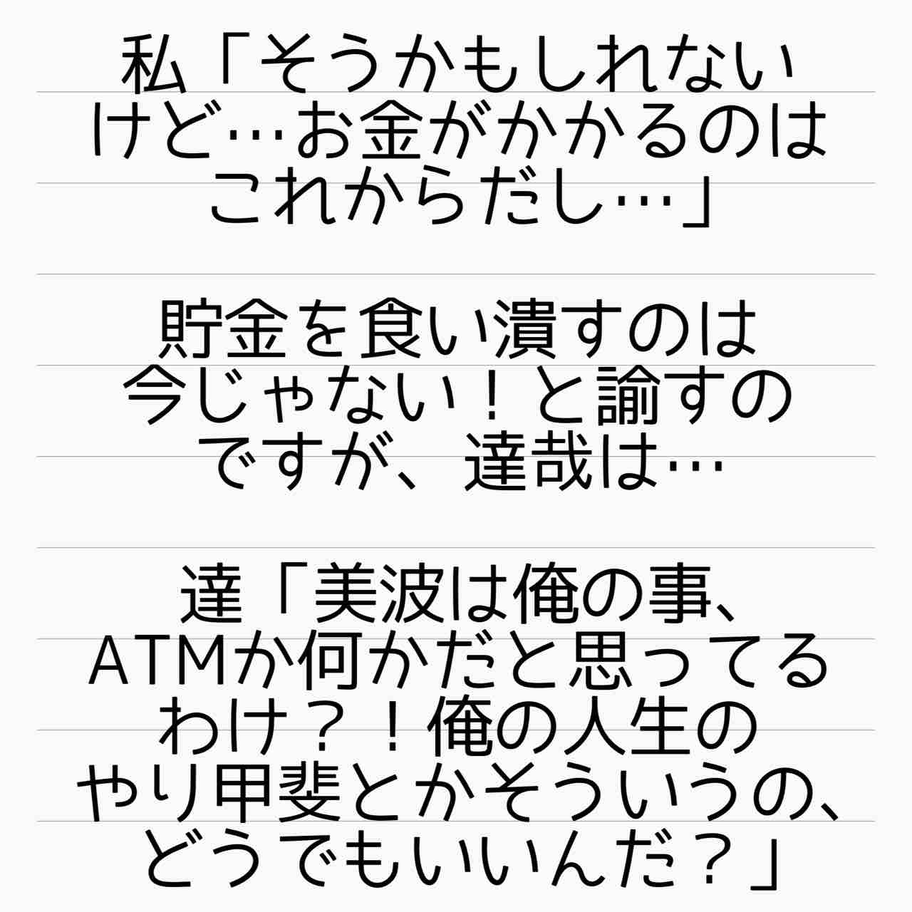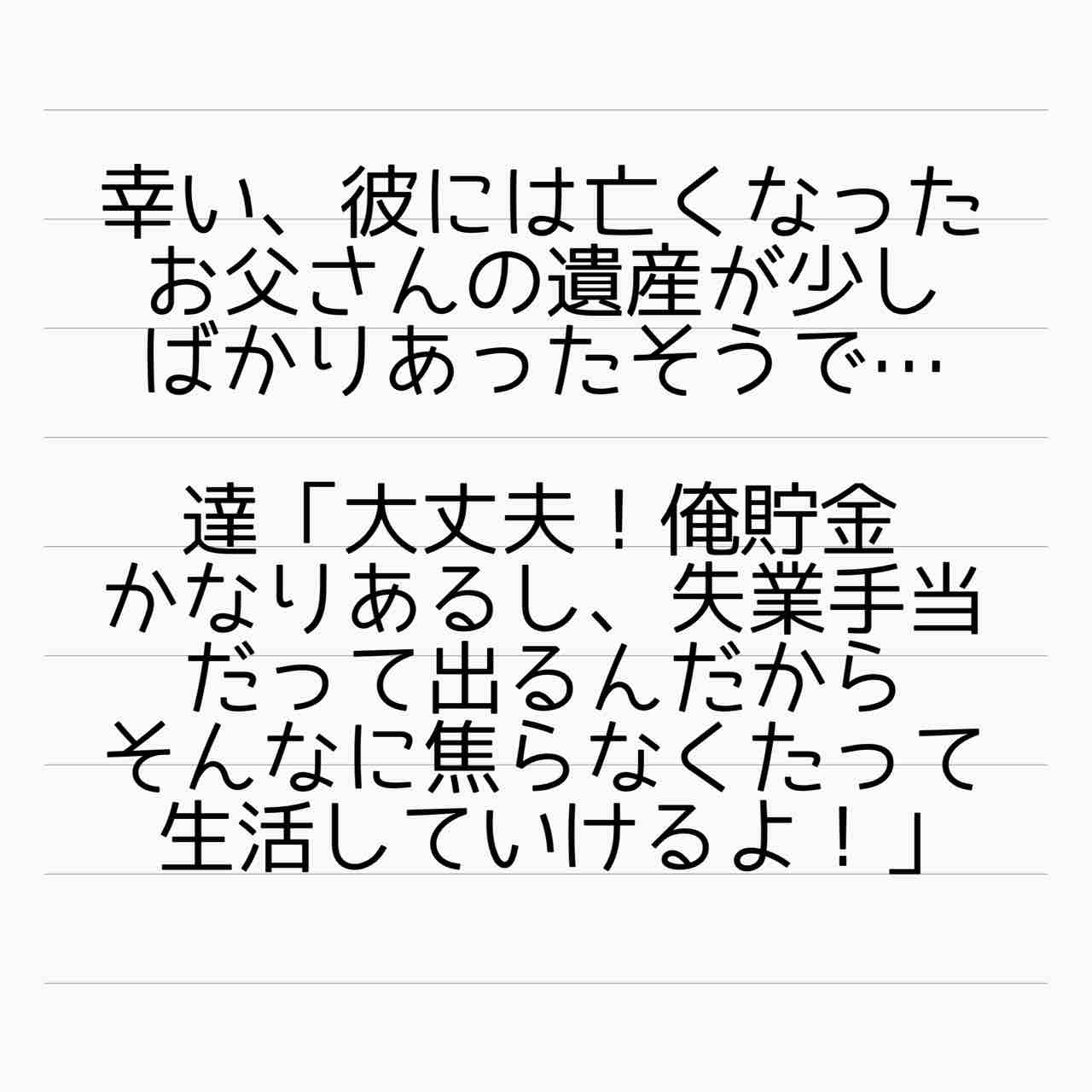 結婚相手は地雷男 3 2022年01月03日 前回のお話はこちら↓「結婚相手は地雷男〜サレ妻美波の逆転人生〜 2」地雷男の匂いがぷんぷんしてきましたよ。。。↓これまでのお話「結婚相手は地雷男〜サレ妻美波の逆転人生!〜」起1・2・3・4・5・6・7・8・9・10管理人あいかのサレ妻ストーリーはこちらから(完結済)【海外赴任中の夫が現地女性と重婚していた話】 サレ妻しょう子さんのストーリーはこちらから(完結済)【産後10日でホームレスになった話】 サレ妻かおりさんのストーリーはこちらから(完結済)【セレブ妻かおりが全てを失いかけた話】 サレ妻美紀さんのストーリーはこちらから(完結済)【ママ友はフレネミー、そして夫の不倫相手】 サレ妻めぐみさんのストーリーはこちらから(完結済)【毒妹戦記〜夫の不倫相手は妹でした〜】 ↑LINEで更新通知が受け取れます。↑Twitter開設しました! 「結婚相手は地雷男〜サレ妻美波の逆転人生!〜」カテゴリの最新記事 タグ :#サレ妻,サレ妻あいか,毒家族,実話,浮気,不倫,離婚,毒親 < 前の記事次の記事 > コメント コメント一覧 (25) 1. ハル 2022年01月03日 12:21 妊娠検診や父親クラスには行けますよね。 家に居るだけの、プー太郎なんだから… 急かされるのが嫌なら、急かされないように、自分なりの考えを述べてみてよー。 どうせノープランなんだろ?🙄 0 サレ妻@あいか がしました 15. サレ妻あいか 2022年01月04日 02:32 >>1 コメントありがとうございます☺️ 父親クラスとか行ってる場合かよ!としか😂 0 サレ妻@あいか がしました 2. 名無し 2022年01月03日 12:27 地雷男をかばう気はさらさらありませんが例えプーでも妊婦健診についてく人ばかりではないのでその辺りは評価すべきだけど子供が生まれるってわかってるのに仕事を辞めたのだからその時点で見切りをつけるべきでしたね。 0 サレ妻@あいか がしました 3. ハル 2022年01月03日 12:39 >>2 検診や父親クラスより、まずは就活だろうよって気持ちになりました。 たしかに、何かと理由を着けて妊娠検診などに全く参加しない父親はいますからね。 その点は評価したかったけど、外面だけ良くしてる地雷男にイライラしちゃいます💦 0 サレ妻@あいか がしました 6. 名無し 2022年01月03日 13:26 >>3 確かにおっしゃる通りです。ただ仕事も探さない健診にもいかい真性クズが世の中に存在してそうなのでそれよりかは多少マシか?と思っただけでです。真性クズよりかはマシなだけでクズには違いないですね。 0 サレ妻@あいか がしました 16. サレ妻あいか 2022年01月04日 02:32 >>2 コメントありがとうございます☺️ ぷーで妊婦検診にもついてこない人ならすぐに見切りをつけられたでしょうにねえ。。。 0 サレ妻@あいか がしました 4. ふき 2022年01月03日 13:11 外面だけは良さそう…個人的に妊婦検診についてくるのは良いけど夫婦で座らず立ってて欲しい…他の妊婦が座れなくてイライラした思い出があります 0 サレ妻@あいか がしました 5. 名無し 2022年01月03日 13:24 >>4 それは酷いですね。。。そんな非常識なのいるんですか?びっくりですね。 0 サレ妻@あいか がしました 17. サレ妻あいか 2022年01月04日 02:33 >>4 コメントありがとうございます☺️ ですね!その辺り気を遣える人であってほしいです😭 0 サレ妻@あいか がしました 7. ひろみ 2022年01月03日 13:31 外面だけの男って見え見えなのに 父親クラスに出席してるなら終活しろよって 父親になる自覚は皆無だと思うよ 0 サレ妻@あいか がしました 18. サレ妻あいか 2022年01月04日 02:33 >>7 コメントありがとうございます☺️ そうなんですよ!まずはそこだろと。 0 サレ妻@あいか がしました 8. ななし 2022年01月03日 14:02 モラオで「何も考えてないと思っているのか?」って言う人がよくいますが、考えているなら、具体的なプランを説明してくれよって思いますよね。 0 サレ妻@あいか がしました 19. サレ妻あいか 2022年01月04日 02:34 >>8 コメントありがとうございます☺️ そうなんですよ!具体的に説明できないくせに態度だけは偉そうって言うね。 0 サレ妻@あいか がしました 9. リサ 2022年01月03日 14:07 いや…子供がこれから産まれる以上、君の人生より子供の生活の方が大事でしょう… 子供の生活が保証出来る範囲内で君の人生好き勝手やるのは良いだろうけど… 今から子供が産まれてくるのに親としての自覚無さすぎ 0 サレ妻@あいか がしました 20. サレ妻あいか 2022年01月04日 02:34 >>9 コメントありがとうございます☺️ そうなんですよ! たとえ気に入らない仕事でも、子供のためにまずは生活安定させようよと。 0 サレ妻@あいか がしました 25. リサ 2022年01月04日 13:32 >>20 そうですよね! 事前に相談があれば美波さんもギリギリまで働いたり、産休取って復帰したり、パートで働いたり、夫婦二人三脚で色々方法はありましたよね! 2人で子供を育てて行こうって気持ちも足りないですよね😣 0 サレ妻@あいか がしました 10. Kco 2022年01月03日 17:46 こういう奴ってす~ぐ「俺の事をわかってない、妻失格だな」とかって責めて