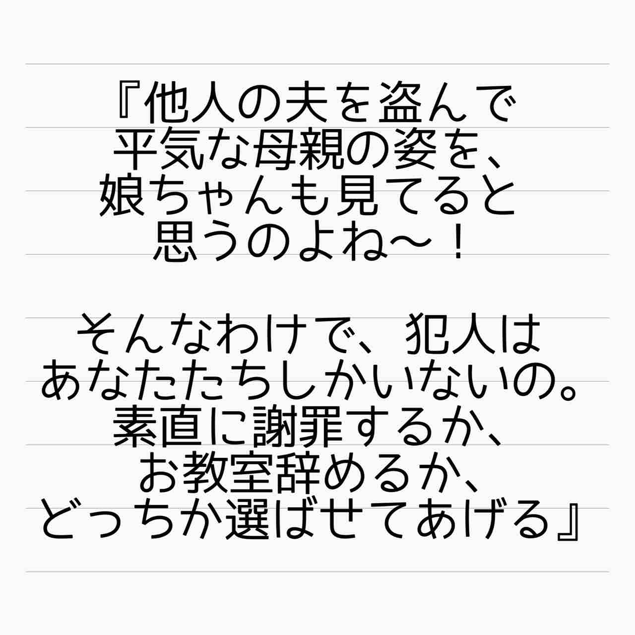 しかし、教室を辞めるか罪を認めるか選ばせてあげる、って・・・。教室の主催者でもないのに、何様のつもりなんでしょうね。