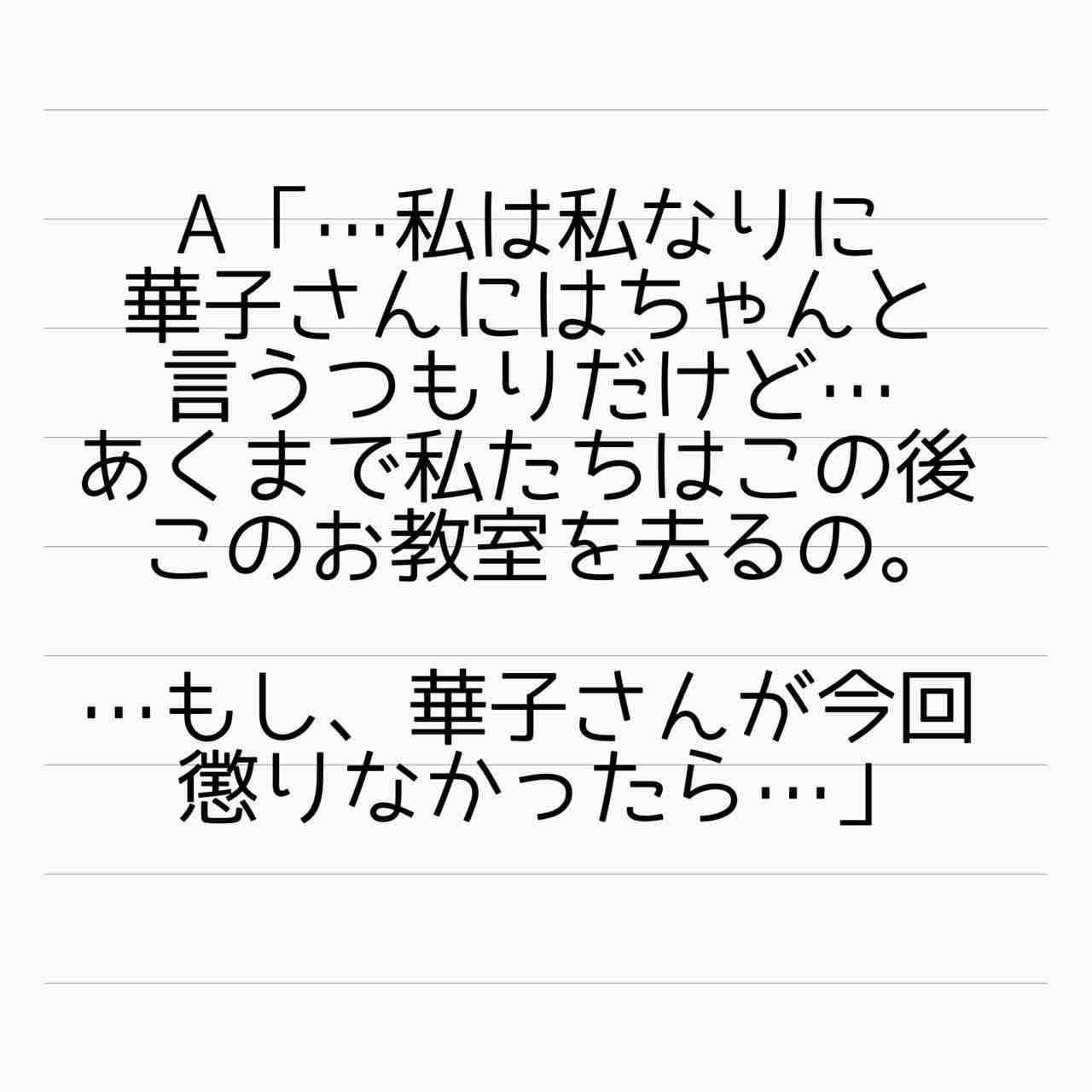 しかし、自分たちはこの教室から去るつもりなんだから後のことは知らない、と言ってもだれも避難できないのに、A子さんはできた人ですね。まあ、そういうところが華ちゃんには余計にしゃくに障るのかも。