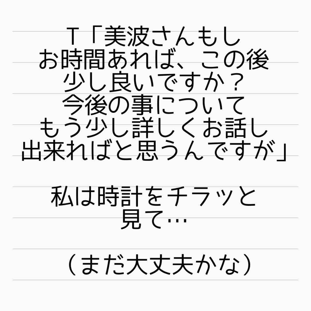 Tさんの「まさか!」って言葉は一緒に仕事は出来ないって事かな。なんとなく奈々子さんは、美波さんをダシに使ってとあわよくばと思ってそうですけど。