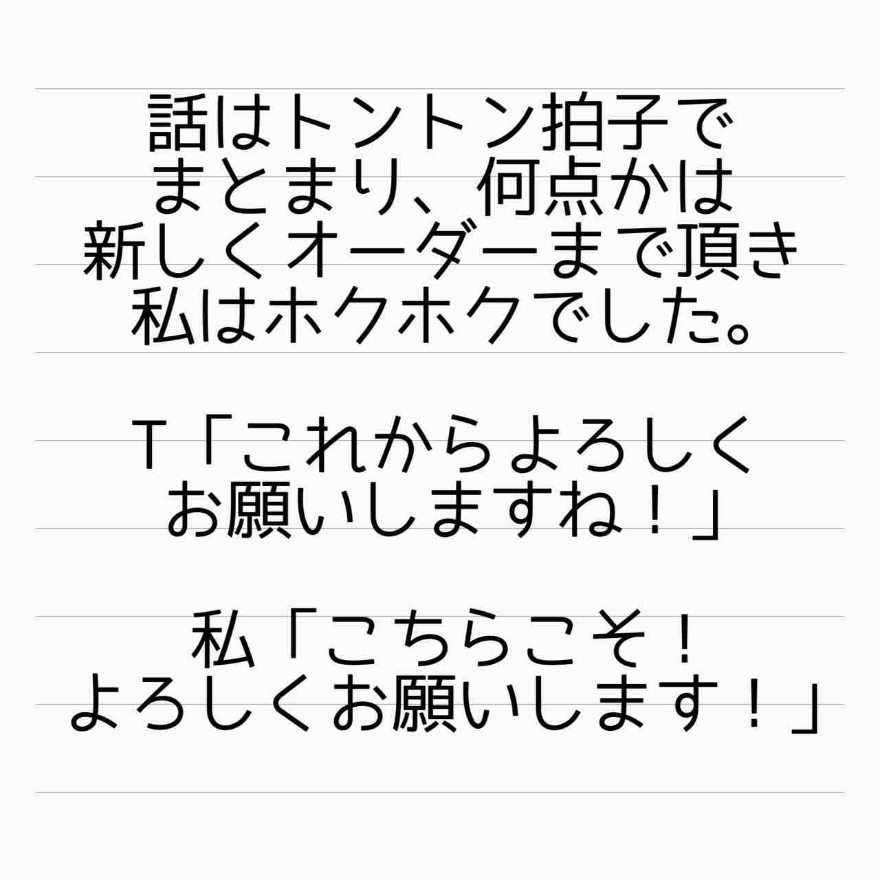 新しくオーダーいただいたし、頑張ってショーで結果残して、タツヤも奈々子も縁を切りましょ!