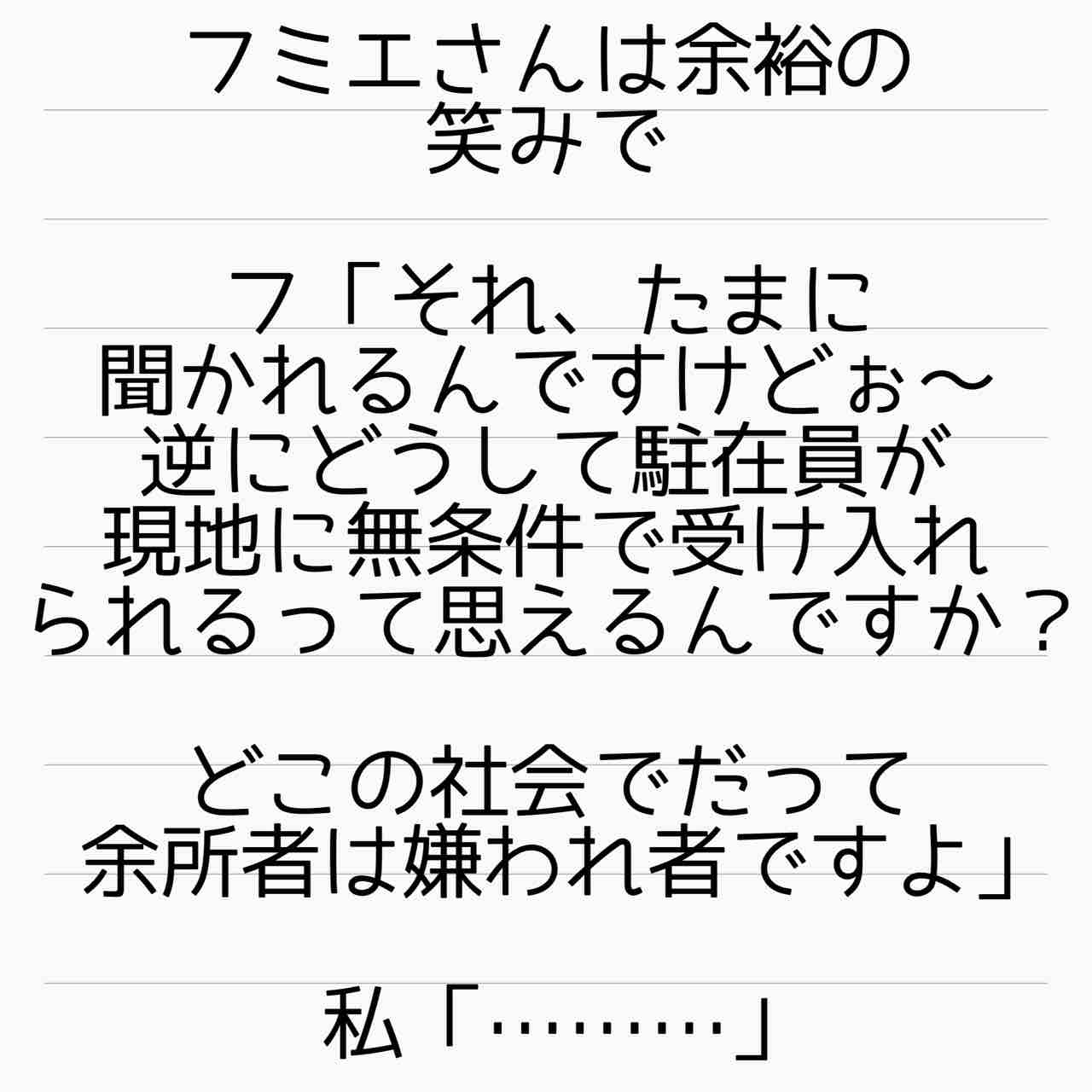 それで駐在を「余所者」って思うのはひねくれてるよ、その会社が日本企業なら現地採用の方が余所者だし、会社への不満は会社に言うべきだし、会社を退職する選択肢だってある。
