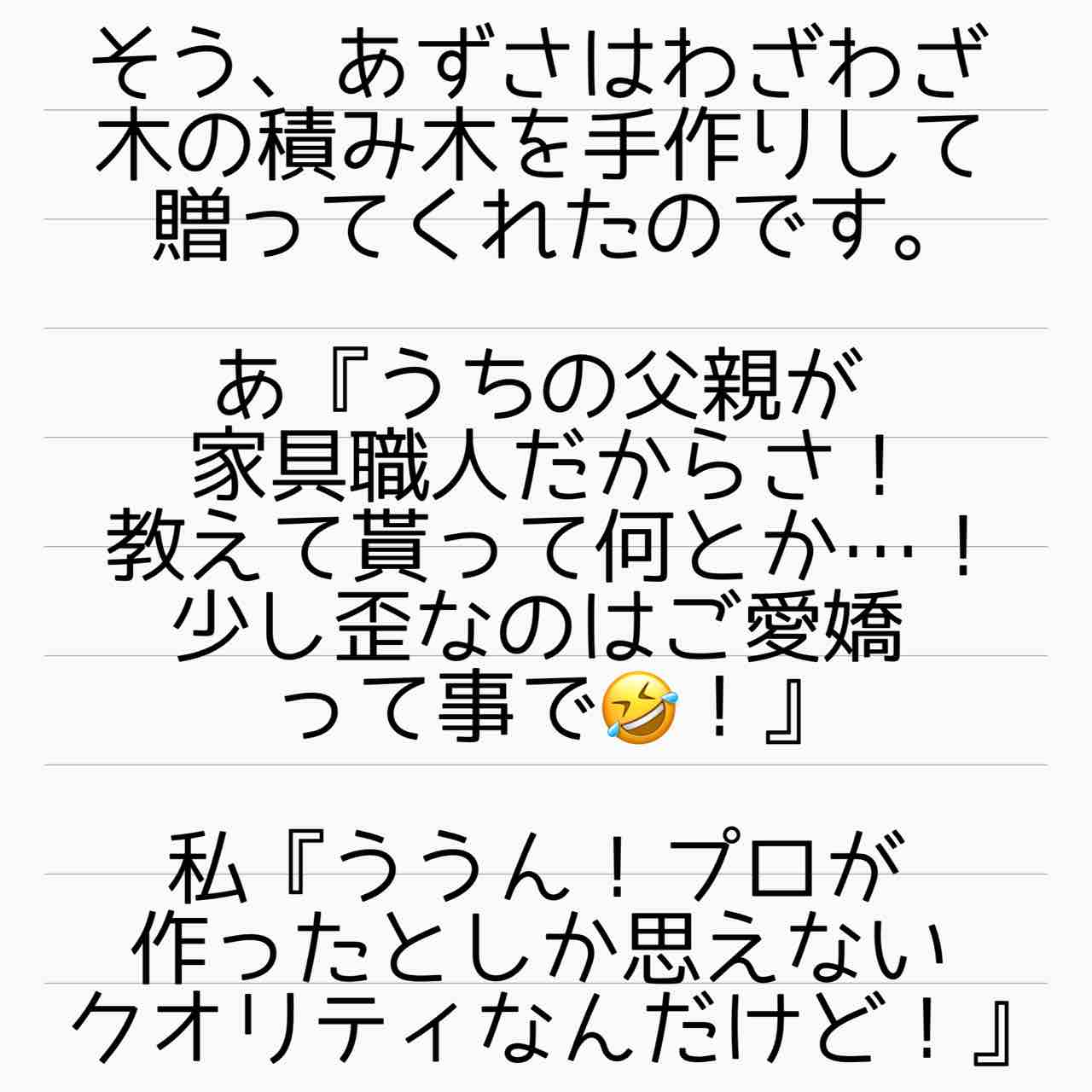 この積み木は新たなトラブルのフラグでしょうか、加恵さんが訪ねて来るときは隠しておかないとしつこく強請られそうですよ💦