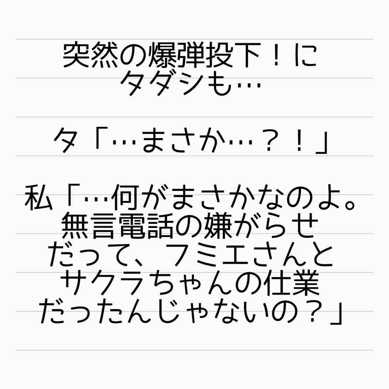 タダシはチカさんに命令口調で説明要求してる場合じゃないですよ。危機感なさ過ぎです。それに、一方の話だけ聞いてた事を反省したんじゃないのですか。自分の妻を嘲笑って追い詰めて罠に嵌めようとしてた人からの情報だったって分かっても尚、チカさんを疑うのですか。その情報のせいで自分は…と被害者面するつもりなのですか。