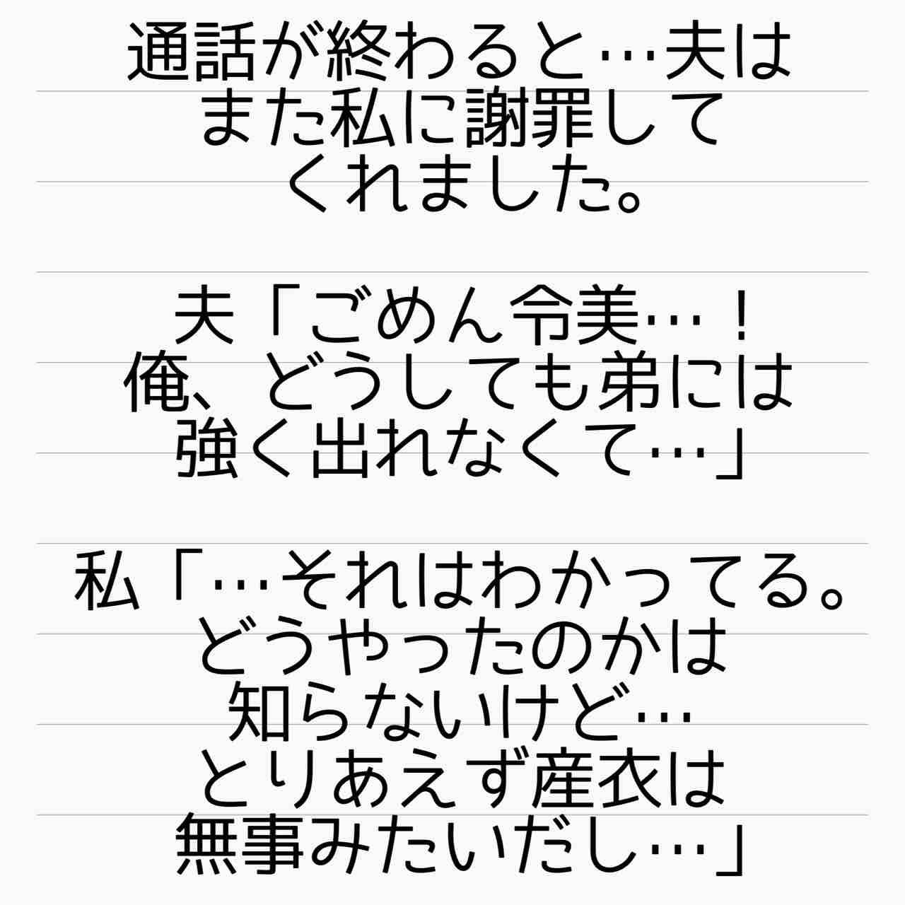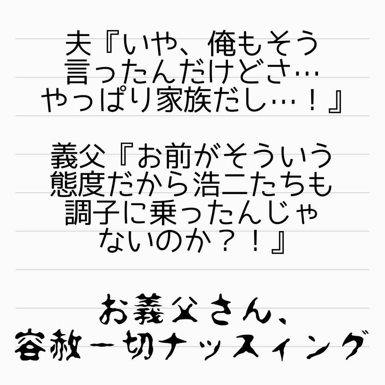 義父の発言からそんな感じはしないですが、夫も家族だから、お兄ちゃんだからって言葉を免罪符に色々搾取されて洗脳されているのかなって思えてきます。