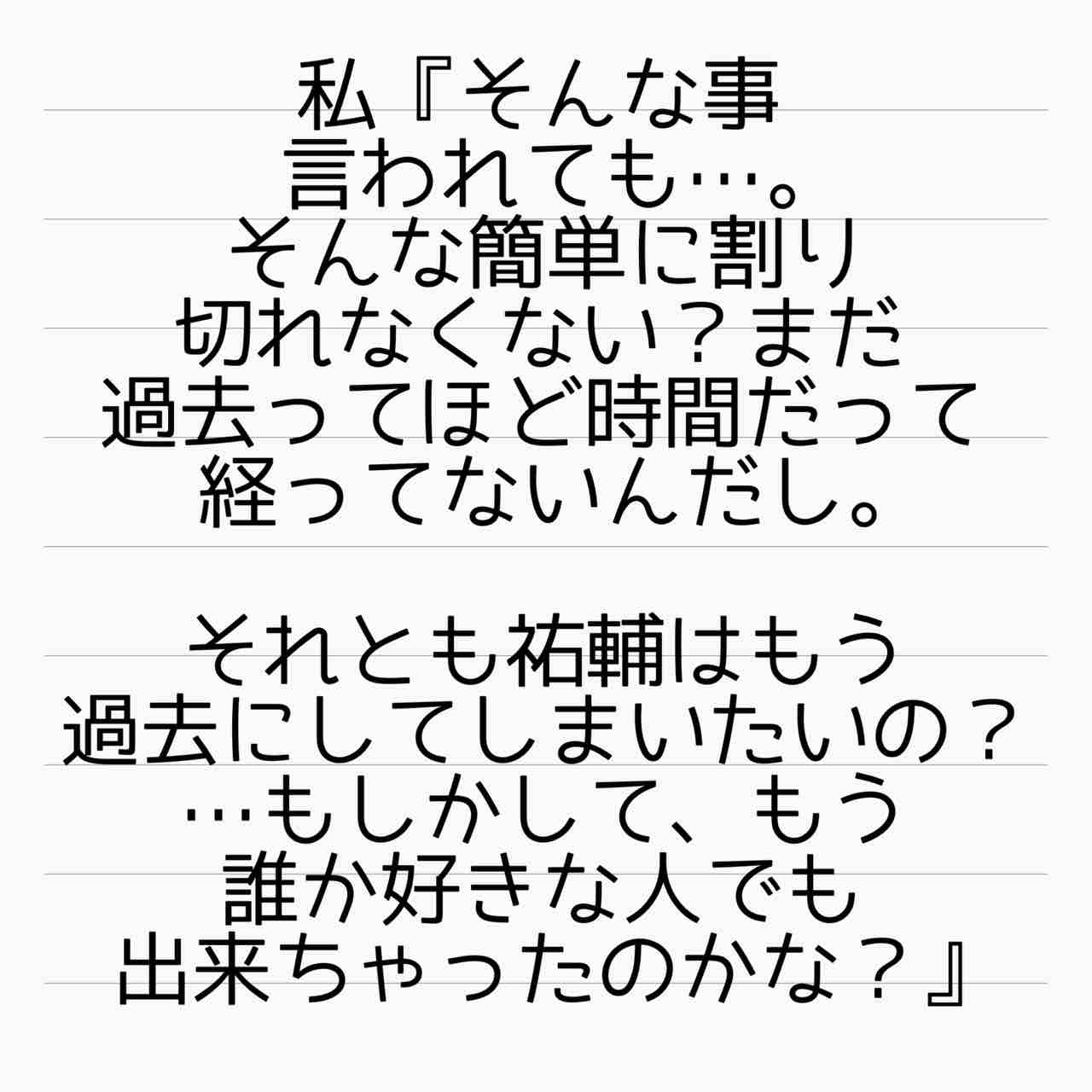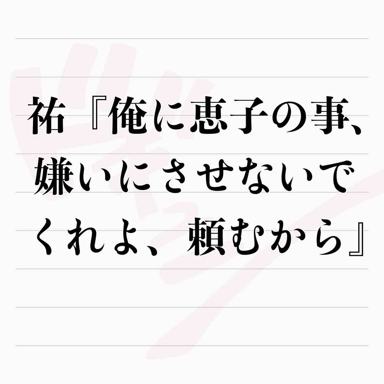 祐輔は次の道へ進むのに、恵子さんが煩わしいんですよね〜。人に嘘ついて傷つけてでも、自分に都合の良いようにしようとしたからなのにね〜。潔く事実を認めて、きちんと終わりにしていれば、こんなことにならずに済んだのにね。リスクをひとつでも負いたくない、悪く思われたくない、なんて都合が良過ぎ。先が楽しみです!