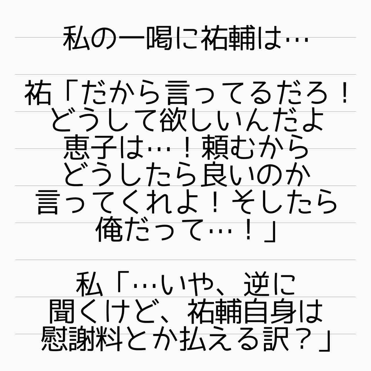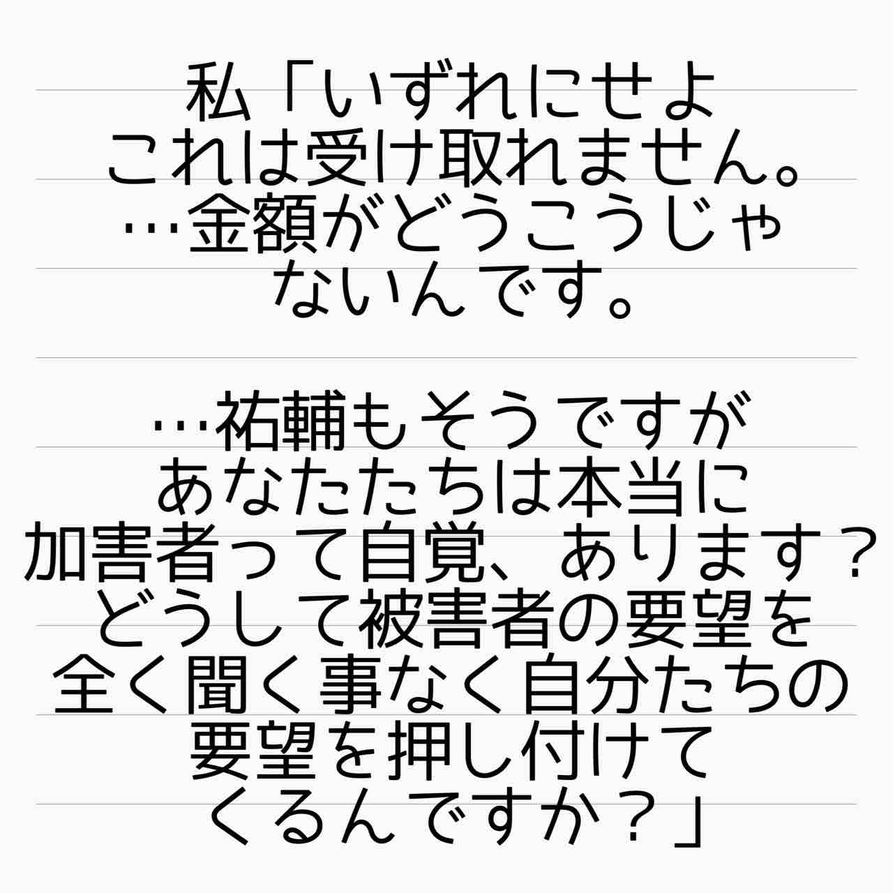 言うこと聞いといてくれればいいはずの恵子さんが怒ってめんどくさい、仕方ないから金で黙っとけよって気持ちが祐輔からも親からも透けてて、しかとそのお金すらケチってる感じが本当に許せないね。