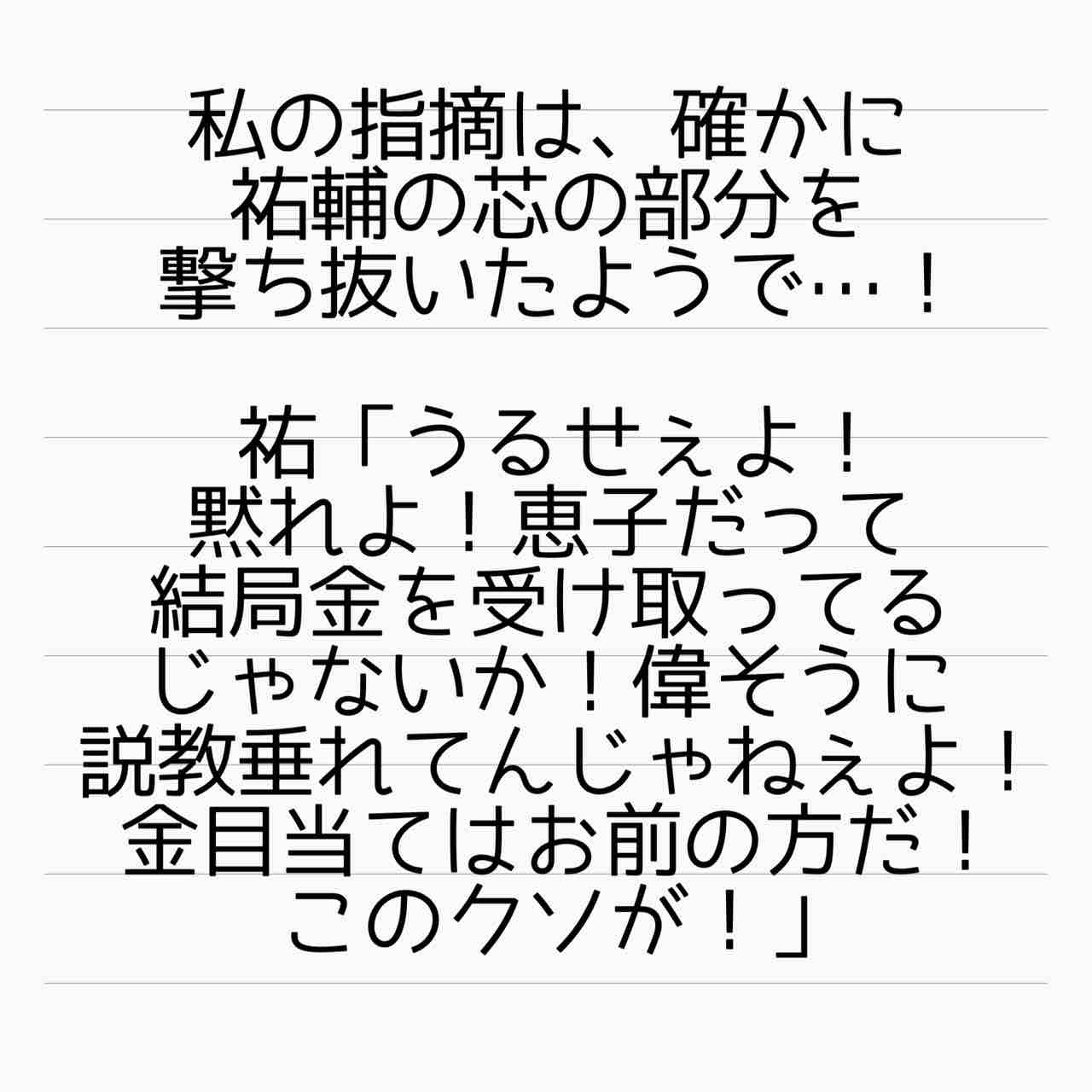 元々の元凶は全て祐輔自身の行いで、悪手続きの結果、こうなっているわけで、恵子さんを恨むのは筋違いでしょう。