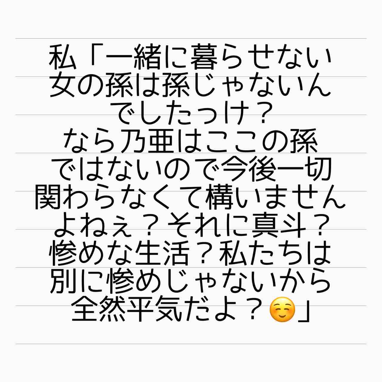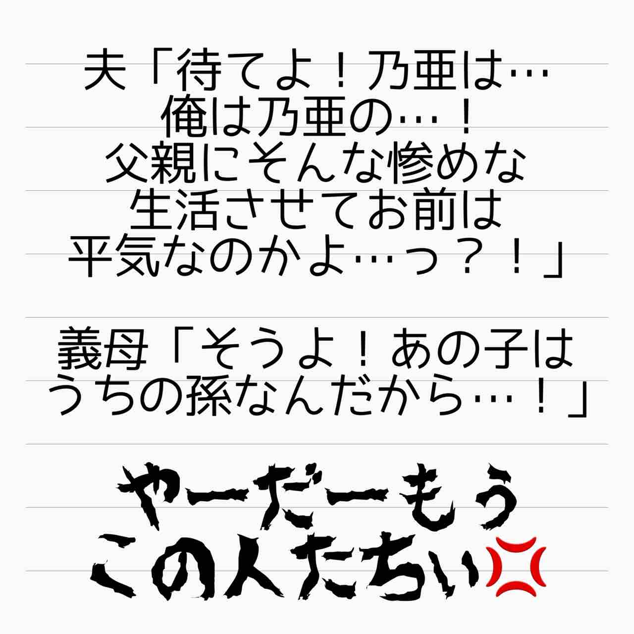 乃亜ちゃんはもう真斗のことなんて父親とおもってないし、義父母もじいちゃん、ばあちゃんとも思ってないよ。