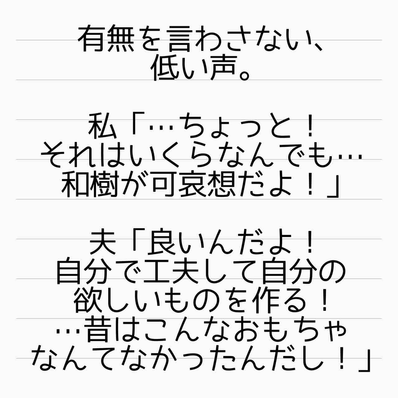 お菓子だけでなく、おもちゃも奪うとは…本当、自己満の世界で家族犠牲にしてるだけの最低な父親