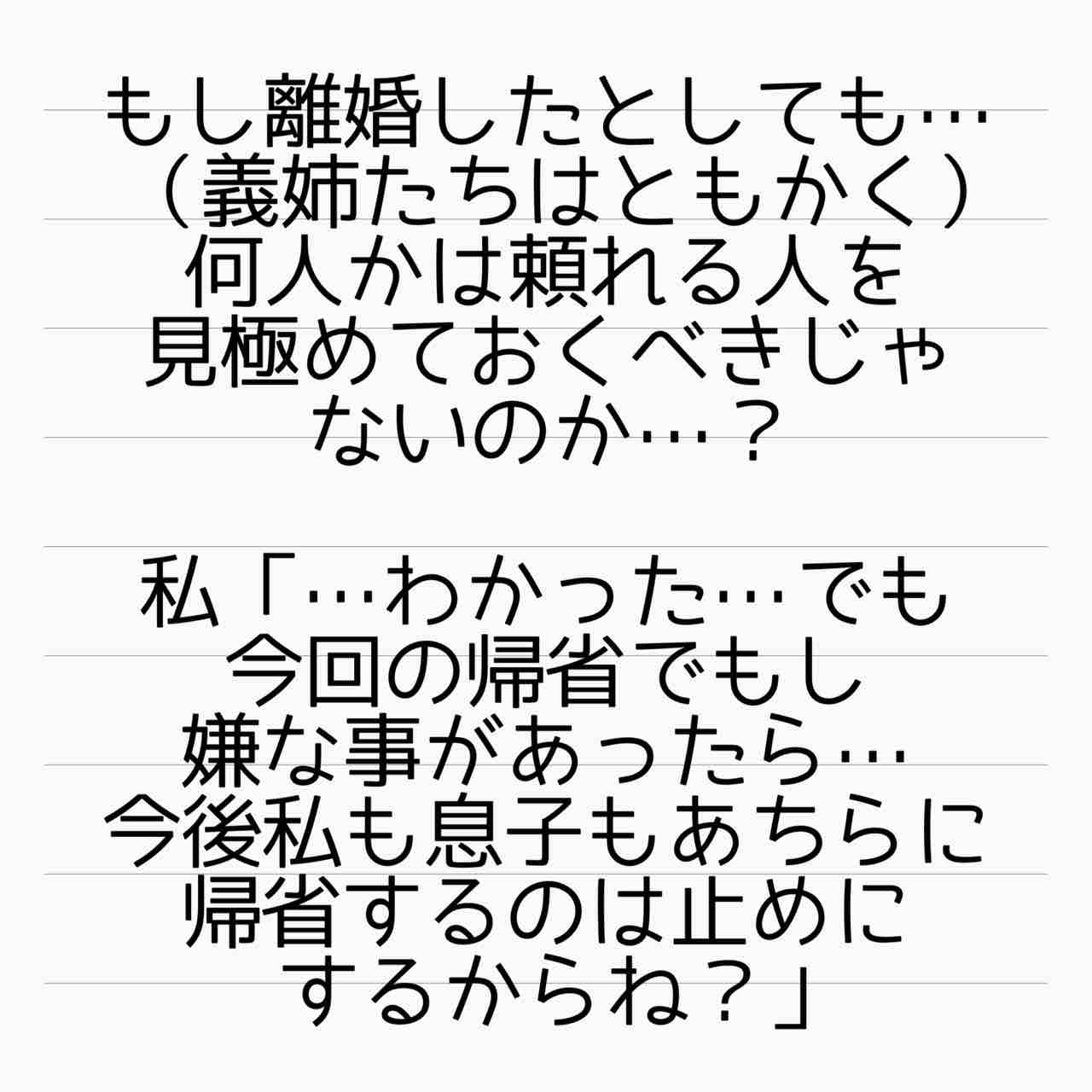今のところ、いいように義理姉と旦那に手のひらで転がされてるから、相手の懐に飛び込むなら、すぐに綻び見つけても噛みつかないで情報収集に徹底したほうがいいかも、親戚が多いなら尚更、知らない情報も多いだろうし。今まですぐ立ち向かって撃沈するから、今回は慎重にはこんでほしいな。
