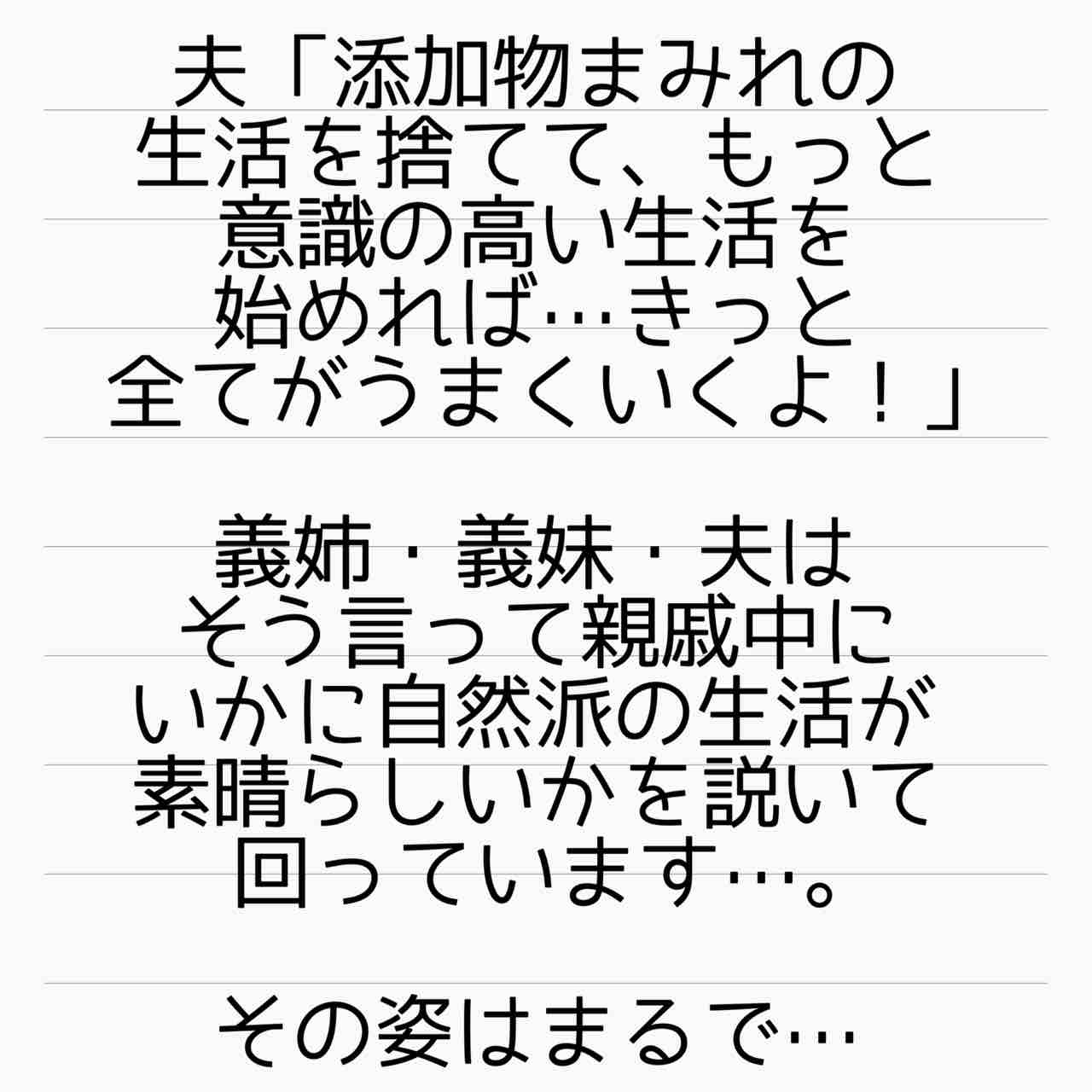 でも、無添加の化粧品は良くても、勝手な基準の過激な自然派生活は、親戚のおばさま方も、さすがにドン引きだと思うけど。