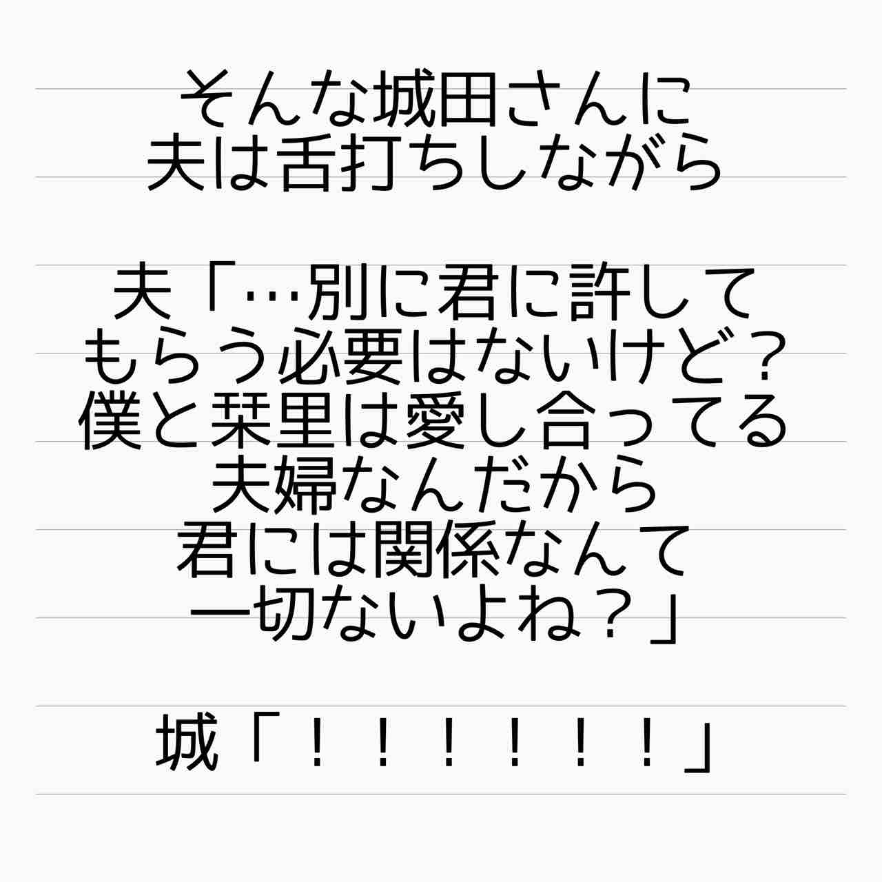 城田の魂胆って最初は主任に気に入られれば会社で居場所が安泰♪くらいの物だったはずなのにどこで勘違いしちゃったんでしょうね…。