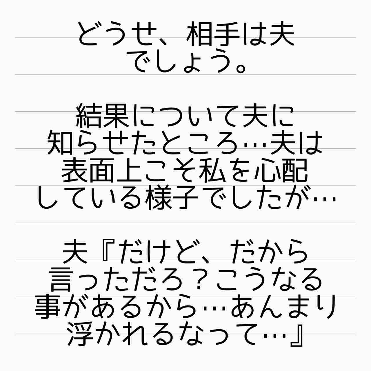 全ての元凶は旦那なんだから全部受け止めろよな。例えば全てを知った不倫相手が奥さんと同じ結果になったとしてもな…!!!!ちゃんと償えよ、いろいろ。