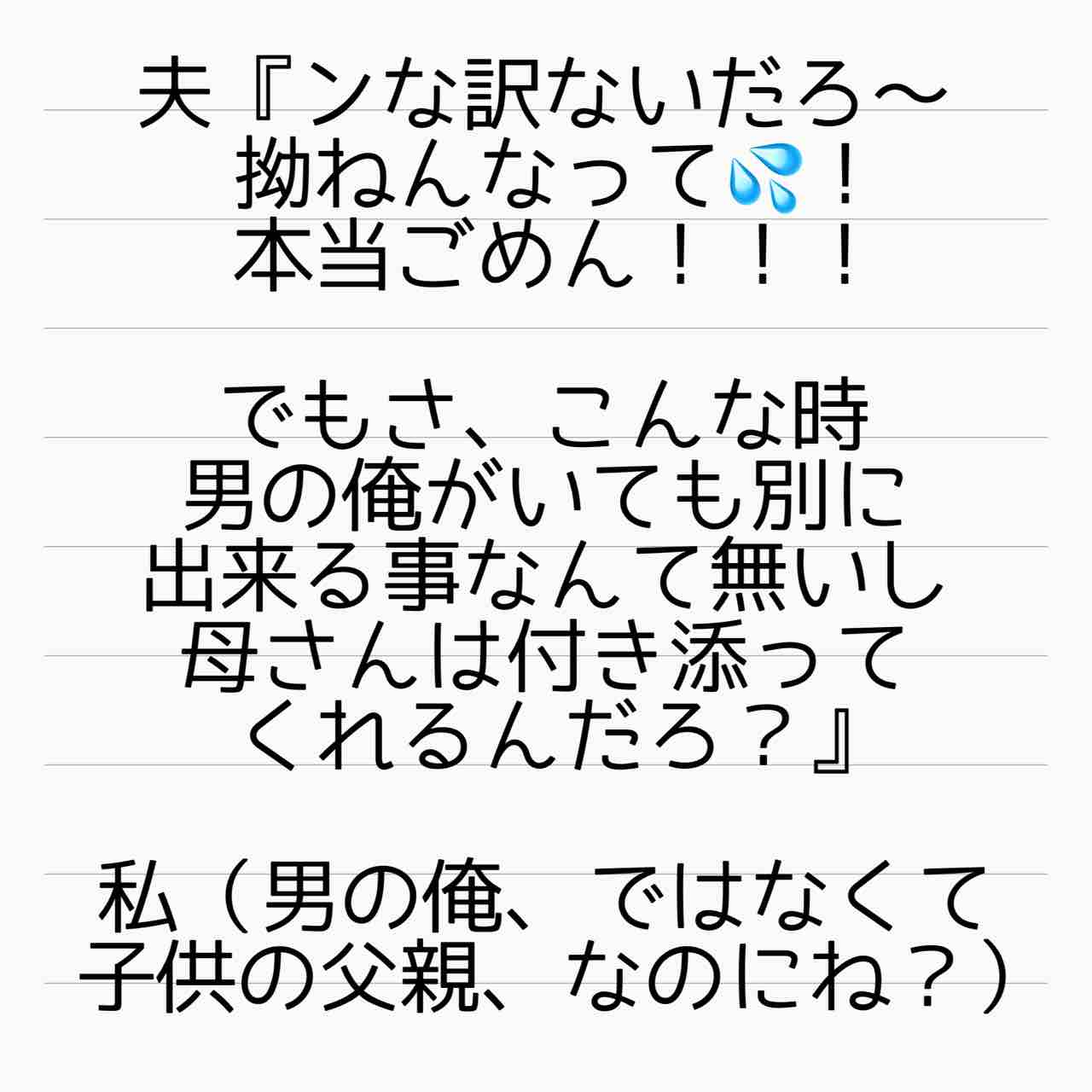 それに出来ることがあるかどうかじゃなくて、不安だから家族に付き添って欲しいのは当然なのに…クズ夫がもし交通事故にでも遭ったとしても「出来ることは無いから」ってお見舞いにも行かなくて良いって事ですか🙃