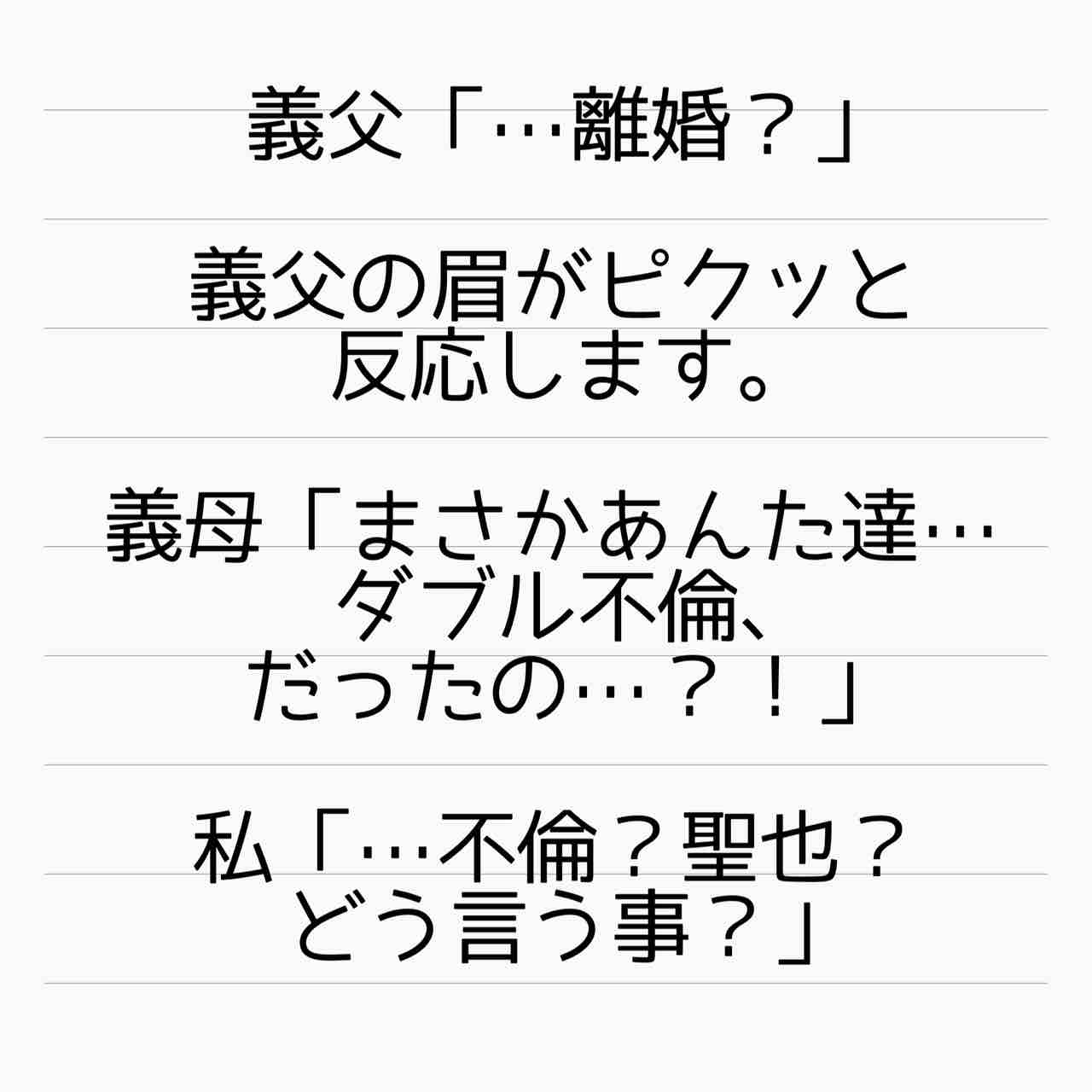 最初は何か危ないことをするんじゃないかと思ってましたが、このまま離婚を拒否するのかもしれないと思うようになりました。この後、10年でも20年でも離婚せず、相手の子供は婚外子のままにする気なのかも。でもそのままじゃ別居に持ち込まれるから、何か条件を出すのかな?で、同居は継続したまま、聖也の生活習慣病計画を続けるとか。