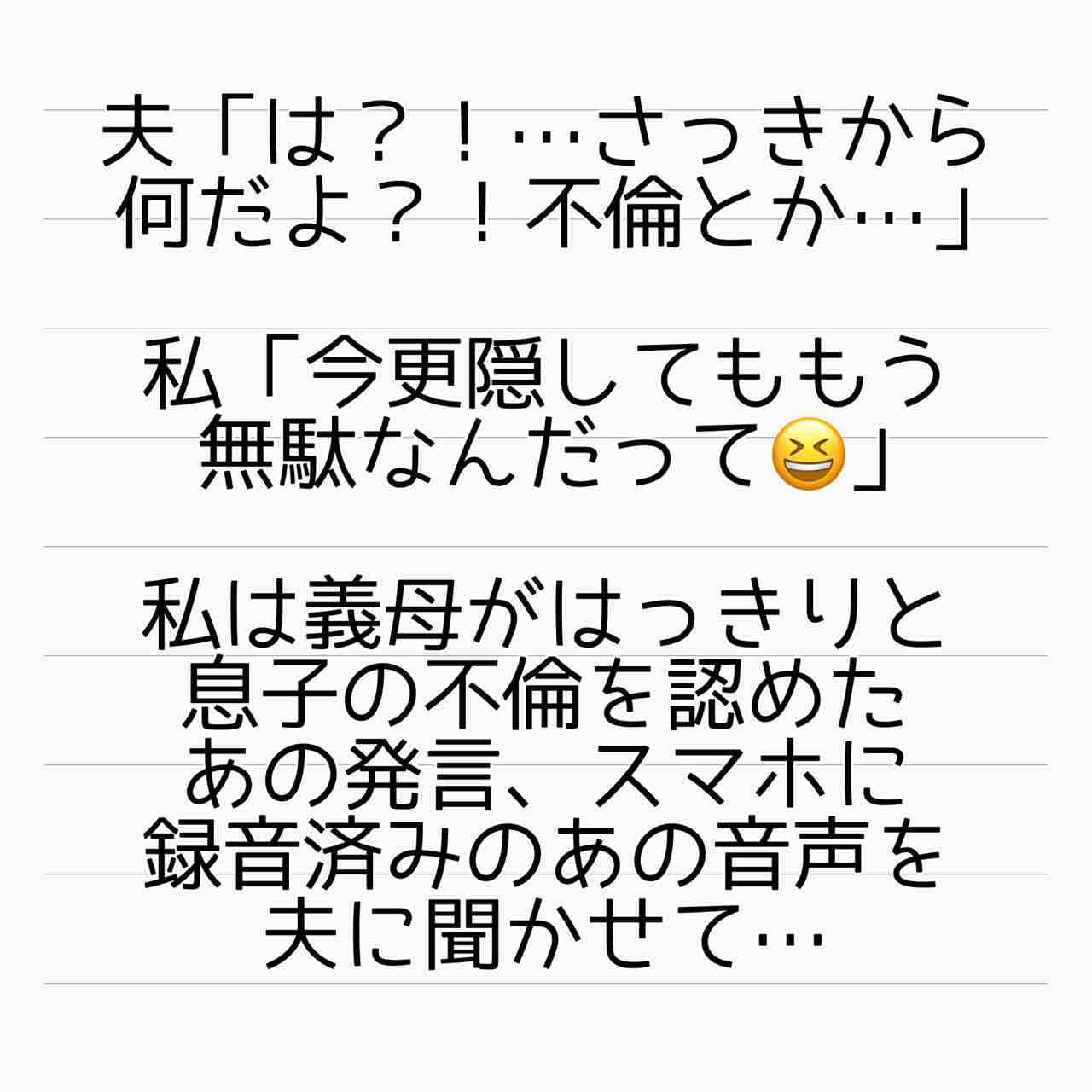 しかしあの義母さん、自分が息子の不倫をバラしちゃったことは、黙ってたみたいですね。今後のことを考えれば、そこが一番重要なのに。