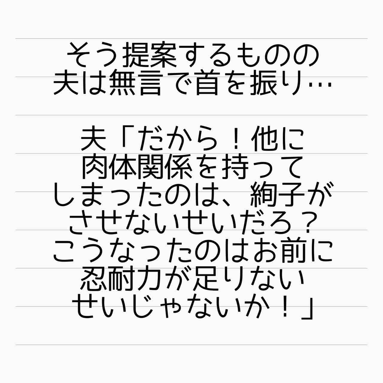 そっちから見てどんな理由があろうとも、不倫は不倫でしかないし。それ以前に妻子を危険な目に遭わせておいて忍耐不足とか…あのまま耐えてたら56される😱