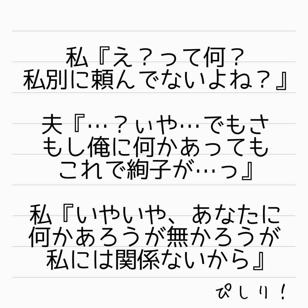 そして〇んだ後なら損しないから、ってどこまでもセコケチだよなあ。なのに今まで生命保険の受取人の名前入れてくれなかったんだね。ますますセコケチだったんだ。って実感して絶望するよね。いや、もうそんな段階とうに過ぎてるよね。
