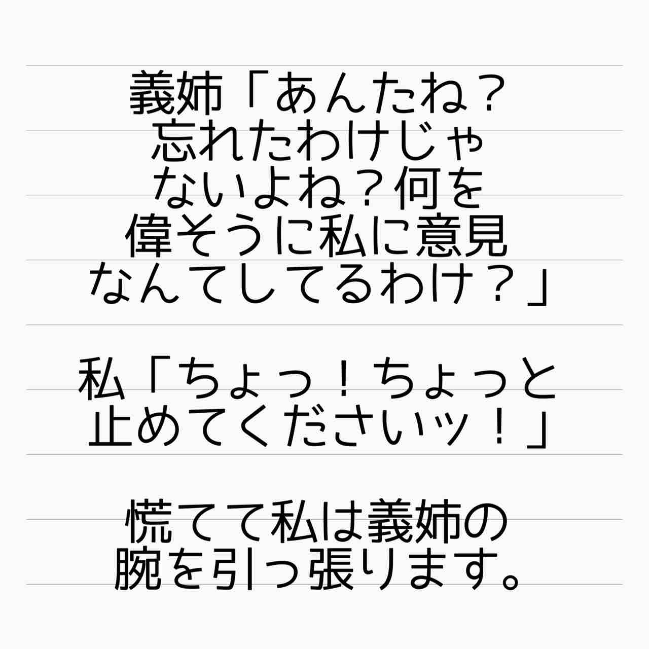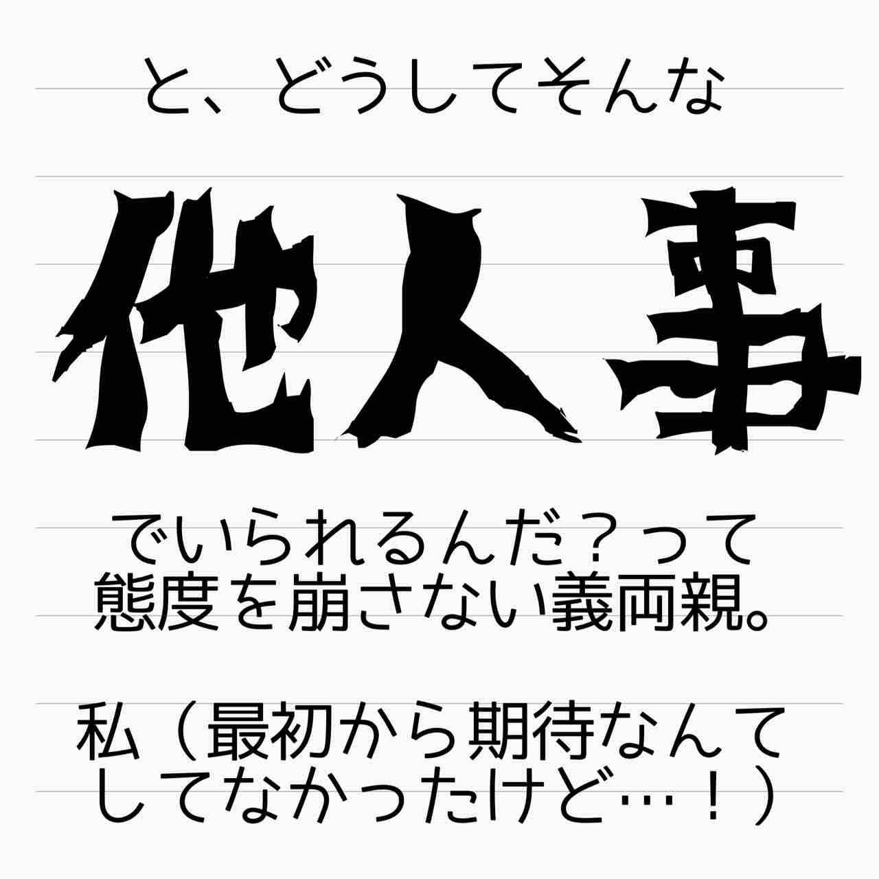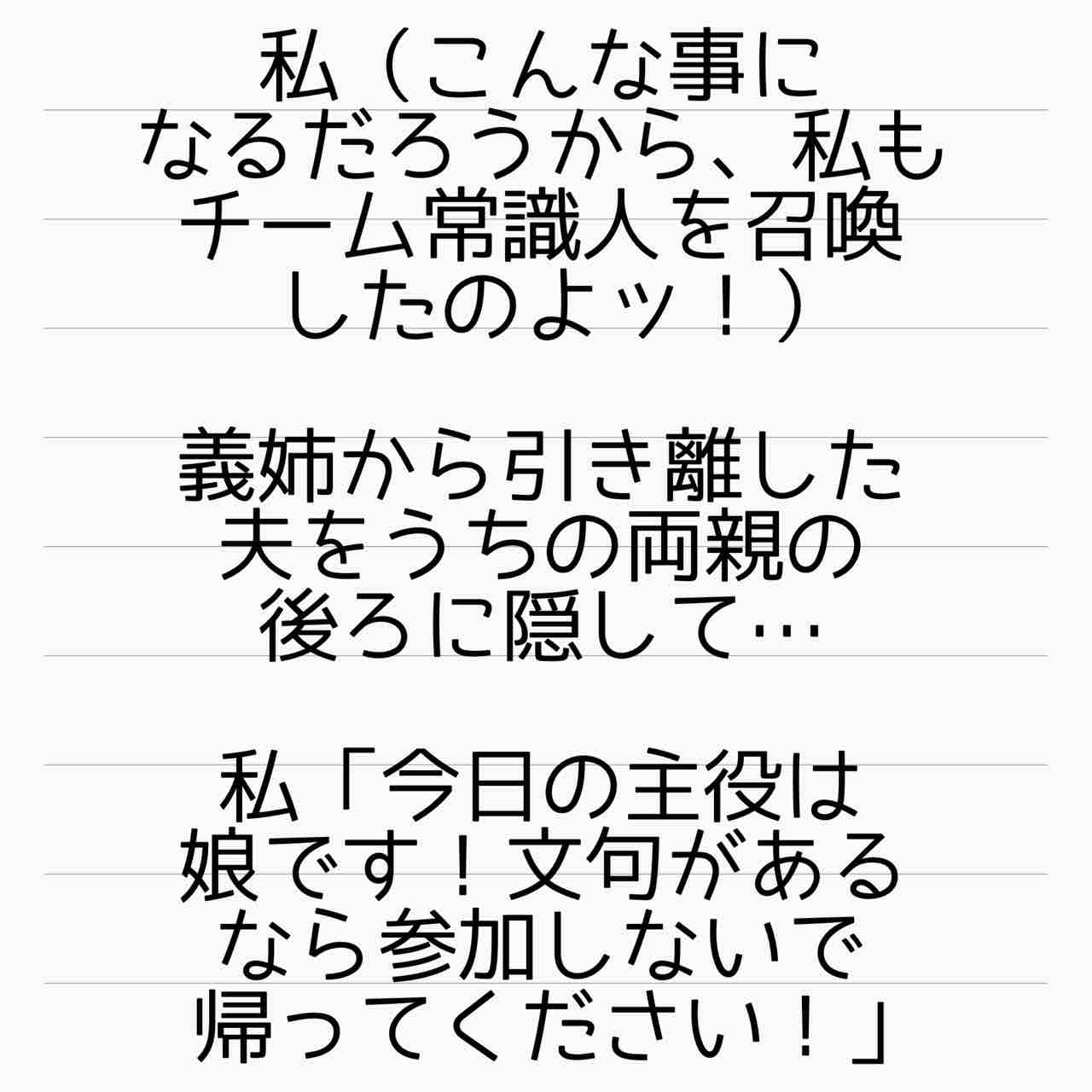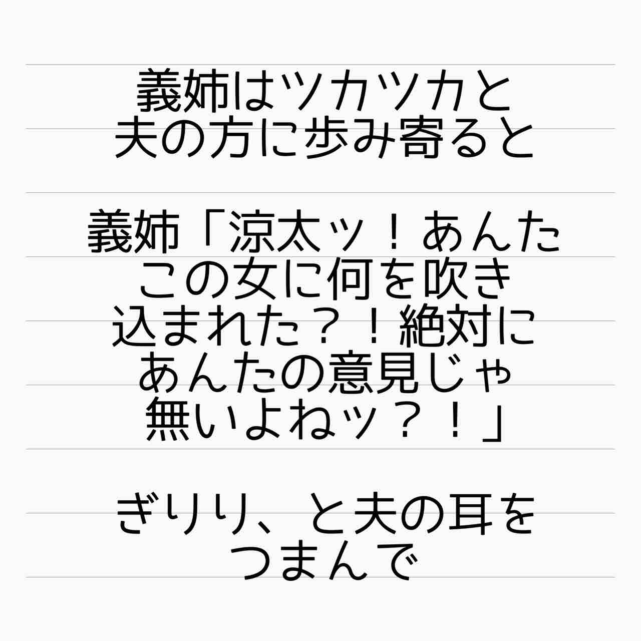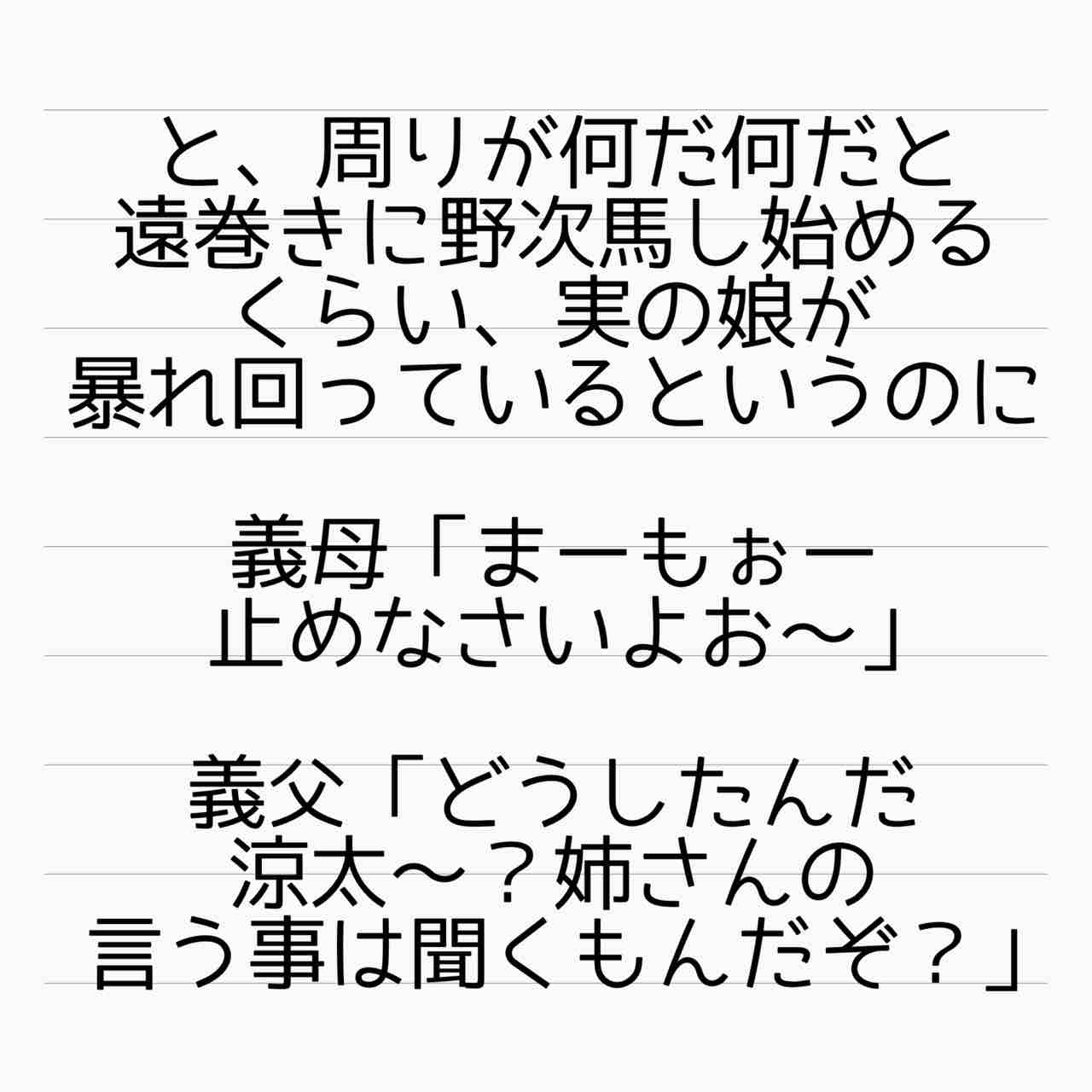 義両親も眺めてないで止めろよ。自分の実の娘が、婚姻で繋がりはあるとはいえ「他所のお嬢さん(しかも赤ちゃん連れ)」を叩いてるの見て何も思わないとか。狂ってる