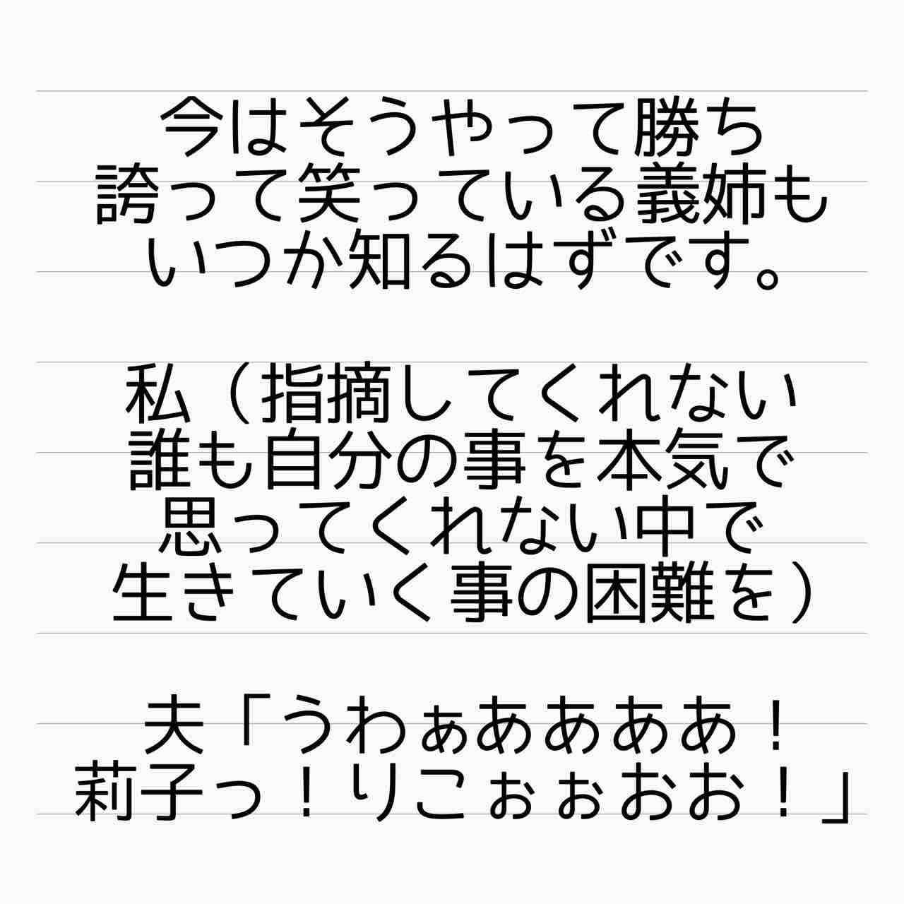 まあ、義姉からしたら一生尽くせなんだろうけど。そんなことをする義理はないってようやく気が付いた?恨むべきは原因を作った両親以外居ないし。再婚すればいい、なんて軽く考えられたのが決定打になった気もする😞