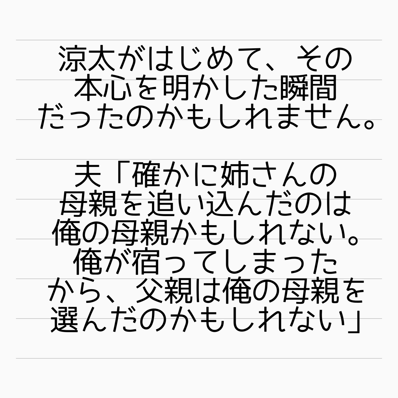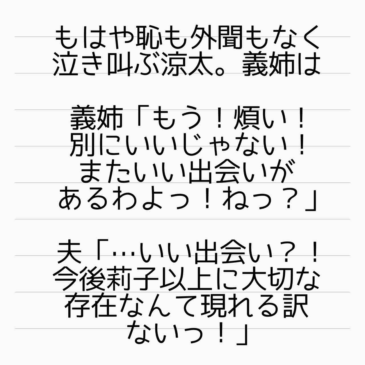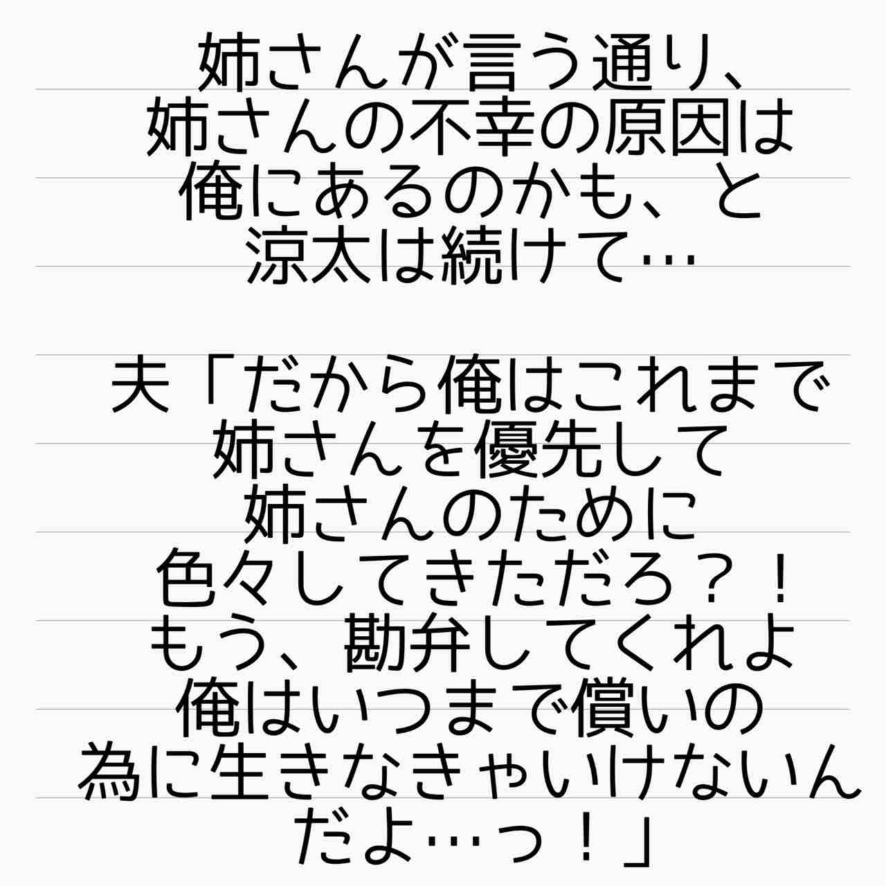 小さい頃からこんな風に言われ続けて罪悪感を押し付けられてた涼太は可哀想だけど、自分から義姉と縁を切る覚悟が遅過ぎる。
