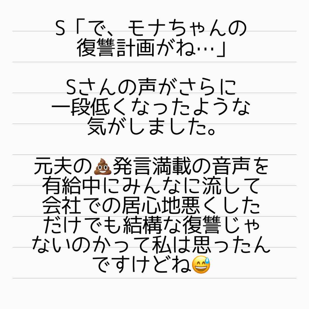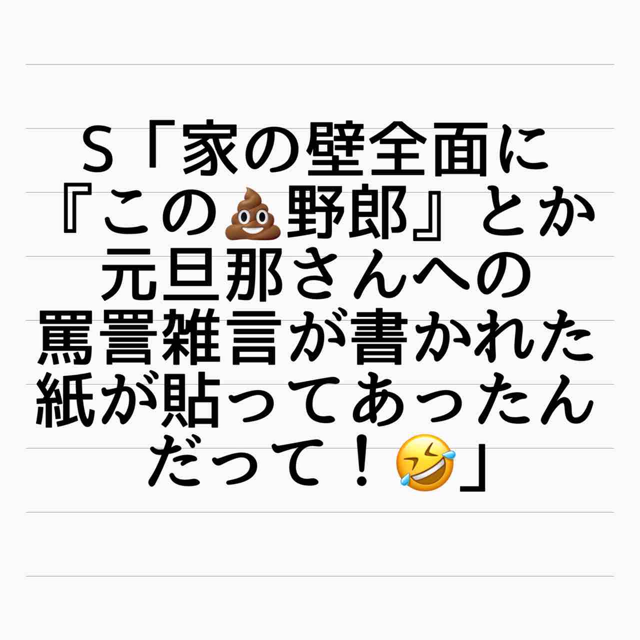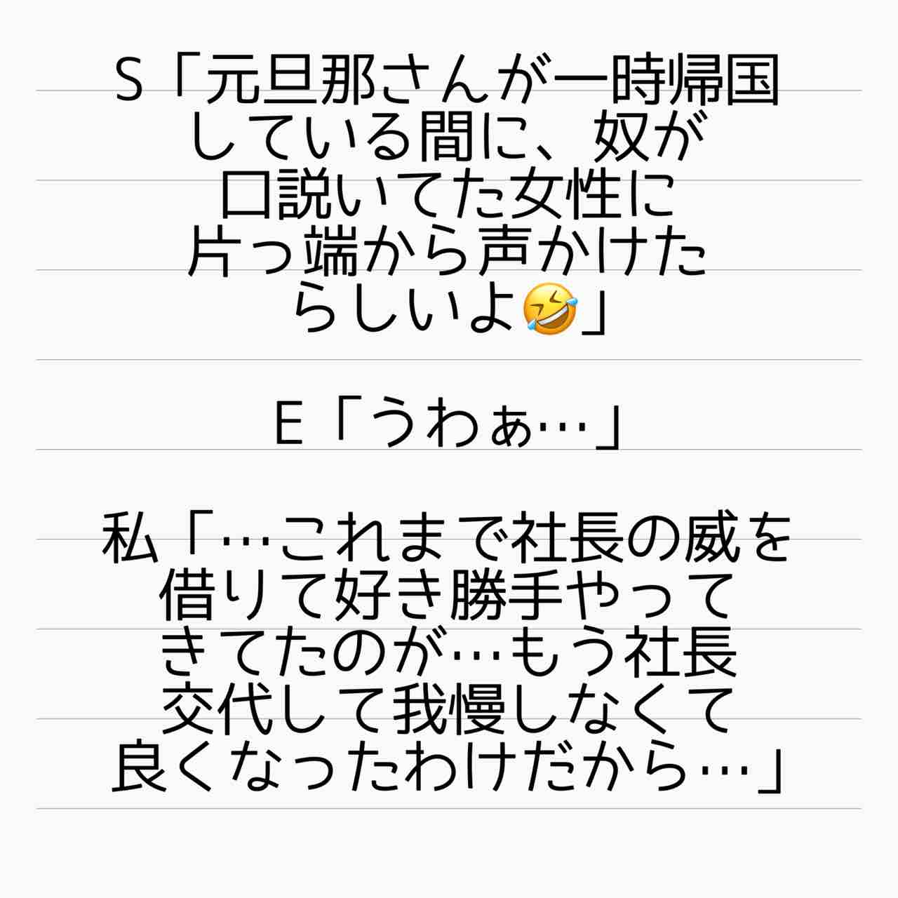 重婚話 小話 モナの話5 2021年03月17日 やってくれました!モナちゃん&現地の口説かれた女性!💩男に鉄槌を下しましたねー見事に!!!!!私たちには想像もつかなかった方法でしたわー!!!! 「重婚話 小話」カテゴリの最新記事 タグ :#インスタ発#離婚#不倫#裏切り#重婚#シタ夫#サレ妻#重婚話 < 前の記事次の記事 > コメント コメント一覧 (2) 1. やかん 2021年03月18日 12:33 紙を貼るだけまだ優しさがあります。 直接書かなかっただけありがたく思えって意地悪な気持ちになりました😉 0 サレ妻@あいか がしました 2. サレ妻あいか 2021年03月18日 15:54 >>1 コメントありがとうございます😊 たしかに🤣壁に書いたら器物破損になるからでしょうか🤔 何にしても、申し訳ないですが、私はめちゃくちゃ痛快でした‼️ 0 サレ妻@あいか がしました コメントフォーム 名前 コメント 記事の評価 リセット リセット 顔 星 情報を記憶 コメントを投稿する