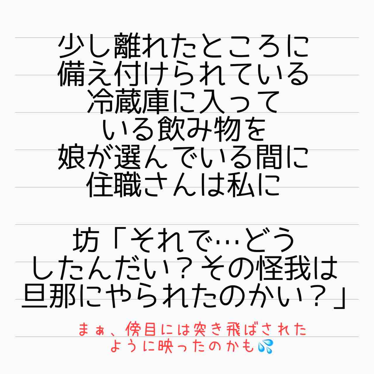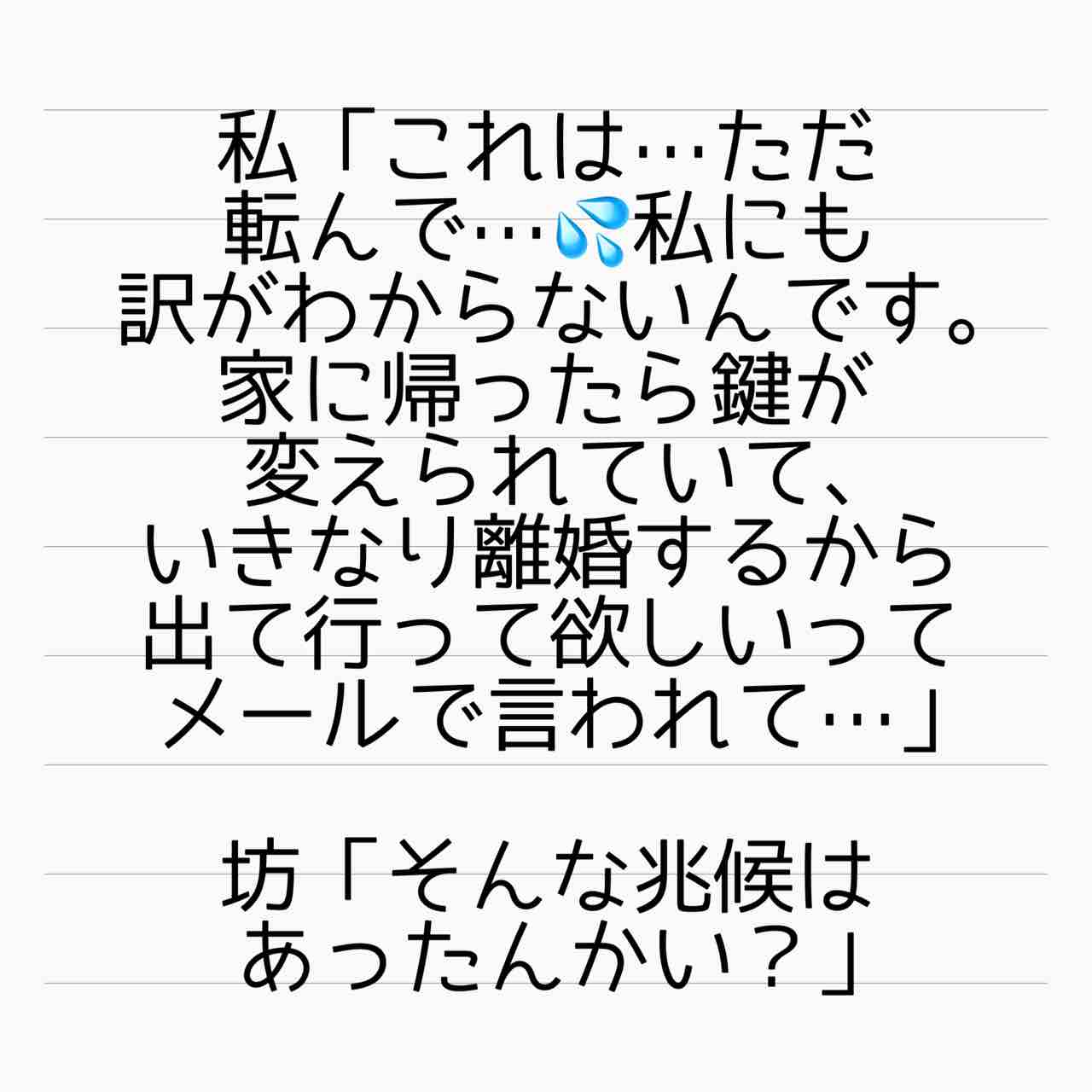 産後10日でホームレスになった話 8 2021年03月16日 もし何か至らない事があるとか…何か理由があって離婚したいならそう言ってくれればよかったのに…こんなわざわざ痛めつけるようなことをしなくても…と思いましたが、これには理由がありました。 「産後10日でホームレスになった話」カテゴリの最新記事 タグ :#ホームレス#サレ妻#され妻#離婚#ステップファミリー#再婚 < 前の記事次の記事 > コメント コメント一覧 (14) 1. fukana 2021年03月16日 15:27 えぇ... ... 理由があるって... ... どんな理由だとしても納得出来ないと思う。 こんな酷すぎる仕打ち。 0 サレ妻@あいか がしました 8. サレ妻あいか 2021年03月17日 01:22 >>1 コメントありがとうございます😊 どんな理由があるとはいえ、許される事ではないですよね‼️ 0 サレ妻@あいか がしました 2. R 2021年03月16日 15:28 続き気になります。 0 サレ妻@あいか がしました 9. サレ妻あいか 2021年03月17日 01:22 >>2 コメントありがとうございます😊 サクサク更新していきたいと思います‼️ 0 サレ妻@あいか がしました 3. とも 2021年03月16日 16:09 こんなむごいことをしていい理由なんてありますか??ほんとこの旦那ひどすぎる(T . T) 0 サレ妻@あいか がしました 10. サレ妻あいか 2021年03月17日 01:23 >>3 コメントありがとうございます😊 人の心を持っていれば、絶対に出来ない事ですよね😭 0 サレ妻@あいか がしました 4. megmix 2021年03月16日 16:10 訳があるにしても酷過ぎる。 大人のすることではない。 怒りが込み上げてきます。 早くどうなったか知りたいです。 0 サレ妻@あいか がしました 11. サレ妻あいか 2021年03月17日 01:24 >>4 コメントありがとうございます😊 色々説明しながらになるので、ちょっとまわり道しますが、ちゃんとお話し出来るよう頑張りますね💪 0 サレ妻@あいか がしました 5. mimimi 2021年03月16日 20:21 ここで お坊さんの呪詛が始まるんですかね、分かります 0 サレ妻@あいか がしました 12. サレ妻あいか 2021年03月17日 01:28 >>5 コメントありがとうございます😊 なるほど‼️そう言う事だったんですね‼️ 0 サレ妻@あいか がしました 6. おちゃむ 2021年03月16日 20:50 ひどいことする 本当に言葉が見つからない 地獄に仏って言葉を思い出しました まずは産後の体が心配です😭 だんなほんと人じゃねぇ!!! 0 サレ妻@あいか がしました 13. サレ妻あいか 2021年03月17日 01:29 >>6 コメントありがとうございます😊 普通の精神の持ち主なら、こんなひどい事出来ませんよね🤷♀️ 旦那さん、他にも色々やらかしてます…。 0 サレ妻@あいか がしました 7. ゆう 2021年03月16日 22:31 理由…?分かった。旦那さん人ではないんですね…? 0 サレ妻@あいか がしました 14. サレ妻あいか 2021年03月17日 01:30 >>7 コメントありがとうございます😊 なるほど‼️地球外生命体だったのか‼️🤣 0 サレ妻@あいか がしました コメントフォーム 名前 コメント 記事の評価 リセット リセット 顔 星 情報を記憶 コメントを投稿する