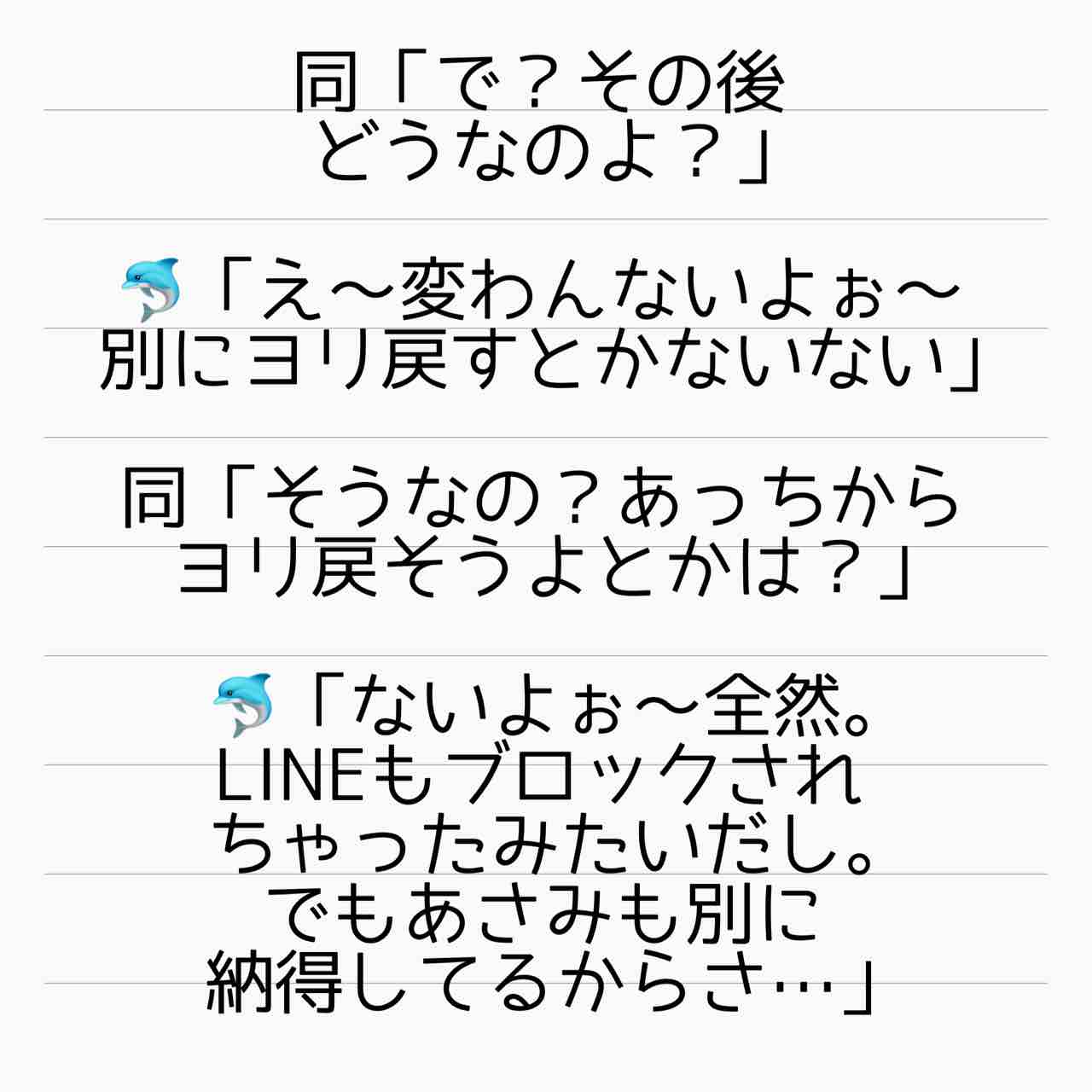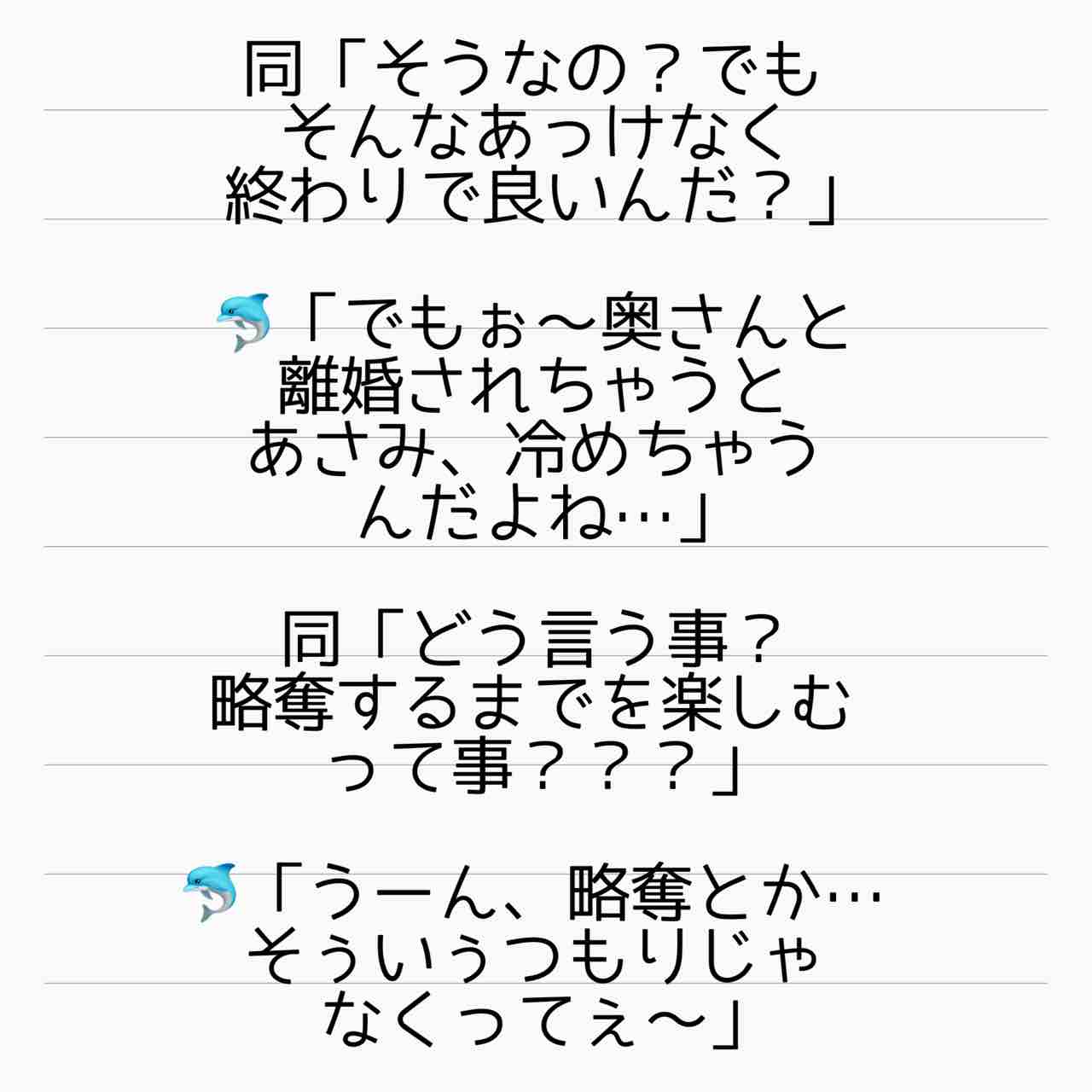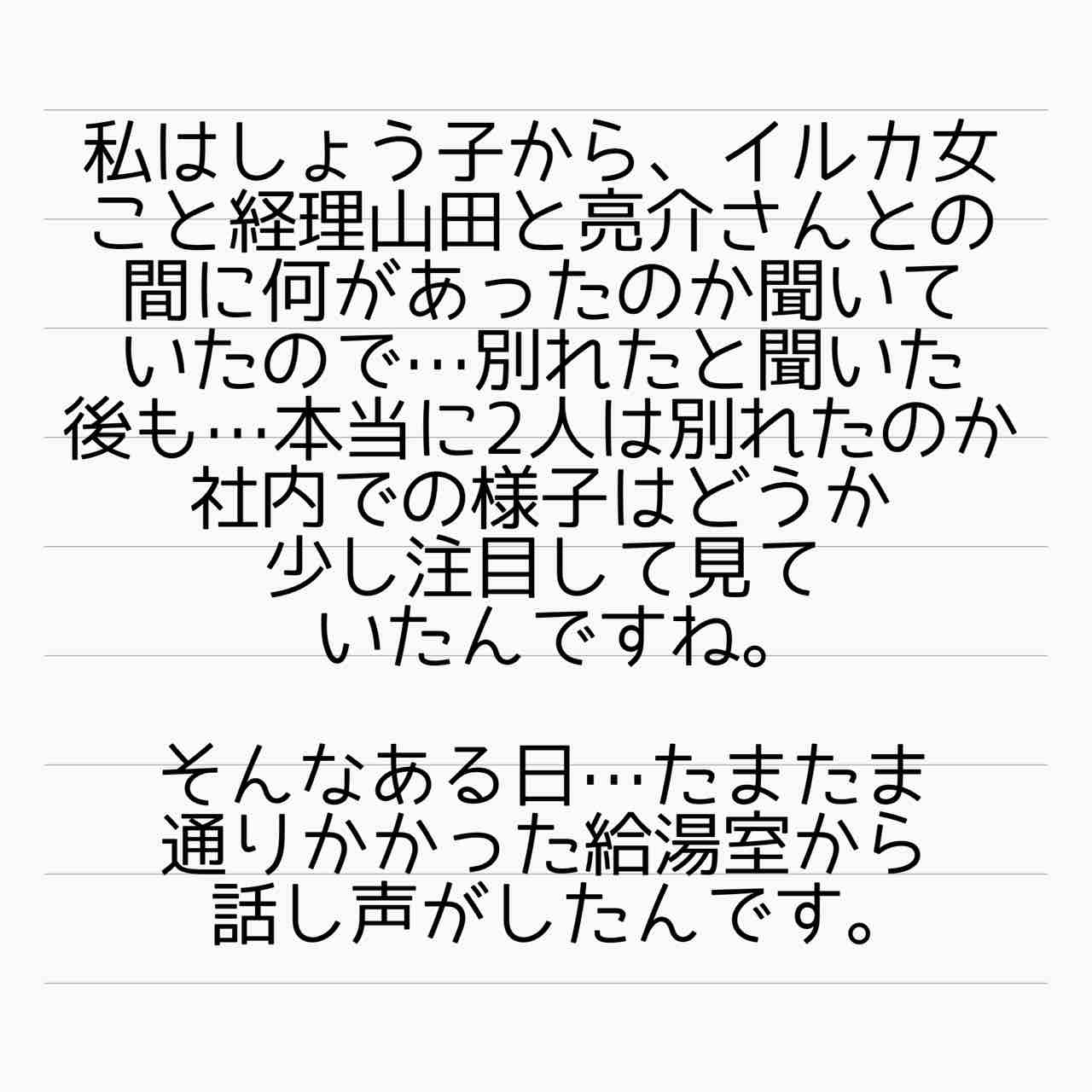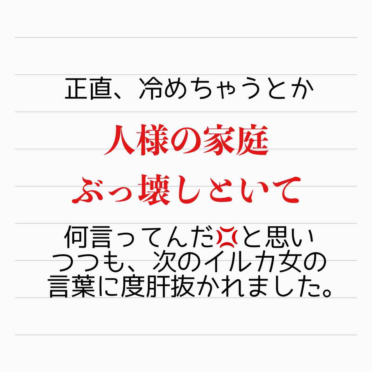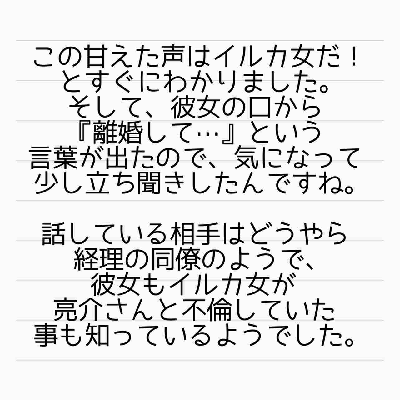 産後ホームレス 番外編 不倫常習犯あさみ 1 2021年03月28日 はいご要望にお応えして、イルカ女の大事件についてお話していこうと思います。しょっぱなから飛ばしています。なんやねんマーメイドって…。あまりの衝撃にしょう子さんに二度見ならぬ二度聞きしました。そうしたら「本当なんです…」って…。口調が違うのは、どうもしょう子さんの前での態度っていうのは彼女の芝居だったようで…一人称も「あさみ」というのが本性だったらしいです。【あいか】 「産後ホームレス 番外編」カテゴリの最新記事 タグ :#離婚#インスタ発#裏切り#不倫#され妻#サレ妻#ステップファミリー#再婚#ホームレス < 前の記事次の記事 > コメント コメント一覧 (2) 1. かたせ 2021年03月29日 23:18 ま、マーメイド…。 危うく顎が外れそうでした…。 番外編とても楽しみです😊 0 サレ妻@あいか がしました 2. サレ妻あいか 2021年03月30日 02:47 >>1 コメントありがとうございます😊 私も聞いた時、聞き返しました🤣 何言ってんの?!って😅 0 サレ妻@あいか がしました コメントフォーム 名前 コメント 記事の評価 リセット リセット 顔 星 情報を記憶 コメントを投稿する