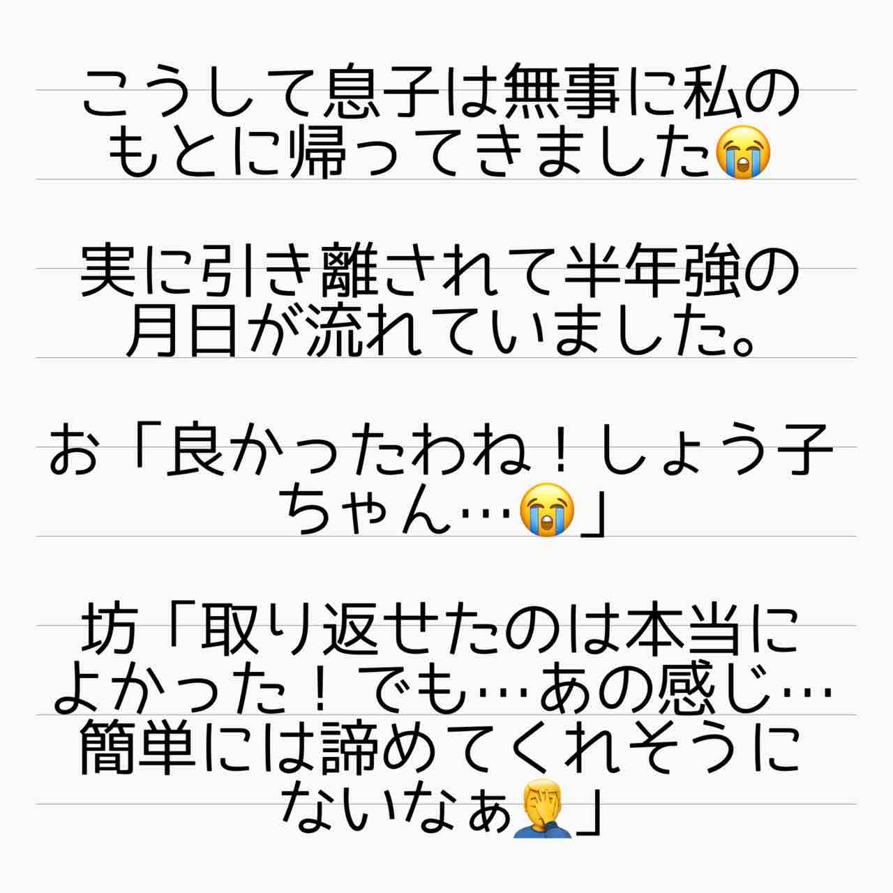 産後ホームレス 発覚編 35 2021年05月09日 まだまだ残される問題、そしてあの宇宙人たちが黙っているわけがなかった!係争編とはいえ…本当に係争できるのか?!【あいか】産後10日でホームレスになった話、第一話はこちらから。 LINEで更新通知が届く、読者登録もぜひ! 「産後10日でホームレスになった話」カテゴリの最新記事 タグ :#インスタ発#離婚#サレ妻あいか#再婚家庭#連れ去り#ホームレス#産後 < 前の記事次の記事 > コメント コメント一覧 (30) 1. ばんぴ 2021年05月09日 12:26 とりあえずよかったよぉぉおおお 娘ちゃんをお迎えに行くのところで泣きそうでした! 0 サレ妻@あいか がしました 16. サレ妻あいか 2021年05月10日 02:37 >>1 コメントありがとうございます☺️ 本当に!私も書きながら泣きそうでした😭 0 サレ妻@あいか がしました 2. あん 2021年05月09日 12:30 半年。長いよね。 笑うようになるし、寝返りもするし。。。 ゆるせない! 0 サレ妻@あいか がしました 17. サレ妻あいか 2021年05月10日 02:37 >>2 コメントありがとうございます☺️ 見逃した成長がたくさんありますよね😭 0 サレ妻@あいか がしました 3. ぐら 2021年05月09日 12:37 半年強…9キロ…、うちの子と同じくらいだぁそれまで会えなかったなんて悲しすぎる。まだ一悶着ありそうですが、やつらをコテンパンにしてほしいです! 0 サレ妻@あいか がしました 18. サレ妻あいか 2021年05月10日 02:38 >>3 コメントありがとうございます☺️ そうなんですよ😢 コテンパン、がんばります! 0 サレ妻@あいか がしました 4. あみ 2021年05月09日 12:37 最後間もない赤ちゃんと半年も離れるのは、半年という時間以上に重たいことなのではと感じます。息子さんがしょうこさんの元に戻ってきてバンザイしたいくらい嬉しいですが、この半年は何をどう頑張っても取り戻すことができません。だから余計に雅彦とミソノ一家に怒りを感じます。早く地獄におちろー! 次回もたのしみにしてます! 0 サレ妻@あいか がしました 19. サレ妻あいか 2021年05月10日 02:39 >>4 コメントありがとうございます☺️ そうなんですよ!時間は逆戻りしませんから😢 でもここから新しい思い出を作っていけますよね! 0 サレ妻@あいか がしました 5. 河童 2021年05月09日 12:47 やっと帰ってきてくれて良かった😭✨ まだまだ辛い状況が続きそうですが、ちょっと太ってしまった息子ちゃんが、しょうこさんの本物の育児でスリムに可愛らしく育っていく姿を見たいな~と思いました。 あんたらには出来ない育児を見せつけてやって欲しいです☺️ 0 サレ妻@あいか がしました 20. サレ妻あいか 2021年05月10日 02:39 >>5 コメントありがとうございます☺️ そう、ここからは本来の姿に戻っていくはずです! 0 サレ妻@あいか がしました 6. T 2021年05月09日 13:00 ほんと、ああいう輩はまさかじゃないんだよー😭 なんで赤の他人に任せる育児前提の人と争わなきゃならんのだ😭 大金はたいてミソノとの子供を何とか作れよ どうせミソノは自分の子じゃないからすぐに育児飽きるよ それこそネグレクトで虐待に そんな状態になった時、雅彦はミソノより息子を庇うこと出来るんだろうか 出来ないよ… ミソノ母もあの女の子供だからと勝手言って手放すよ 無償の愛は絶対注げない 0 サレ妻@あいか がしました 21. サレ妻あいか 2021年05月10日 02:40 >>6 コメントありがとうございます☺️ ミソノと子供、、、ですよね、きっと雅彦はミソノの味方しかしない気がしますよね。。。 0 サレ妻@あいか がしました 7. 2児のママ 2021年05月09日 13:00 無事に息子さんがしょうこさんの元に戻って来れてよかったです😭 半年強も離れ離れにされて、ほんと雅彦達許せませんね! これから何事もなく息子さんと暮らせるように慣ればいいですが… 0 サレ妻@あいか がしました 22. サレ妻あいか 2021年05月10日 02:40 >>7 コメントありがとうございます☺️ もう一波乱あるんです。。。 0 サレ妻@あいか がしました 8. E.A 2021年05月09日 13:23 息子さんが、しょうこさんの所に返って来てよかったです。 このまま、ずっと息子さんと暮らせますように。 0 サレ妻@あいか がしました 23. サレ妻あいか 2021年05月10日 02:40 >>8 コメントありがとうございます☺️ 本当に、願ってやみません😭 0 サレ妻@あいか がしました 9. あた 2021年05月09日 13:24 おめでとうございます。他人ですが、我が事の様に嬉しいです。 良かったです。ちゃんとママのところに、赤ちゃんが帰ってきたんだね。 あとは、雅彦を法的にきっちり、ケジメをつけさせましょう。 0 サレ妻@あいか がしました 24. サレ妻あいか 2021年05月10日 02:41 >>9 コメントありがとうございます☺️ 次回係争編ですが、果たして係争できるのでしょうか…。。。 0 サレ妻@あいか がしました 10. りす 2021年05月09日 13:27 半年も離れ離れになってたなんて。 出産して、一緒に居たい時期なのに、本当にひどい人達です。 常識が通用しない、宇宙人は、どんな手を使ってくるんでしょう?! 0 サレ妻@あいか がしました 25. サレ妻あいか 2021年05月10日 0