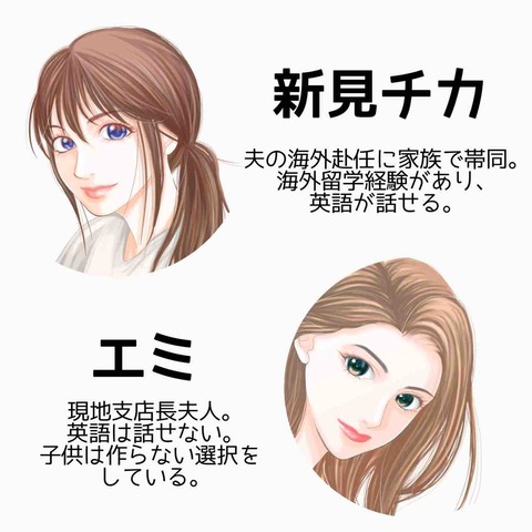 カテゴリ : 各お話の目次&登場人物紹介 海外駐在妻の光と闇 登場人物紹介&目次 海外駐在妻の光と闇ーシタ妻とサレ妻とサレかけた妻ーチカは、夫タダシと息子タイチと三人暮らし。ある日タダシが海外赴任することに!自身のキャリアを諦め、家族で帯同したチカだったが、駐在員の妻としての現地での生活は、思い描いていたものとは違っていたようで…?【 ... 続きを読む